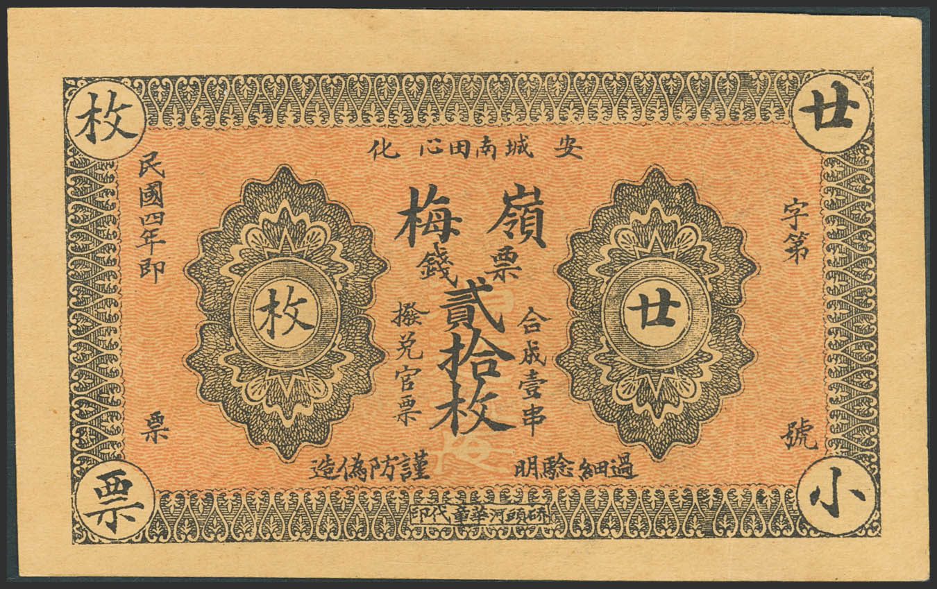 CHINA. 20 Units. 1915. Ling Mei Money Shop. Anhua. Hunan. Private Issue. (Pick: Unlisted). Almost Uncirculated.