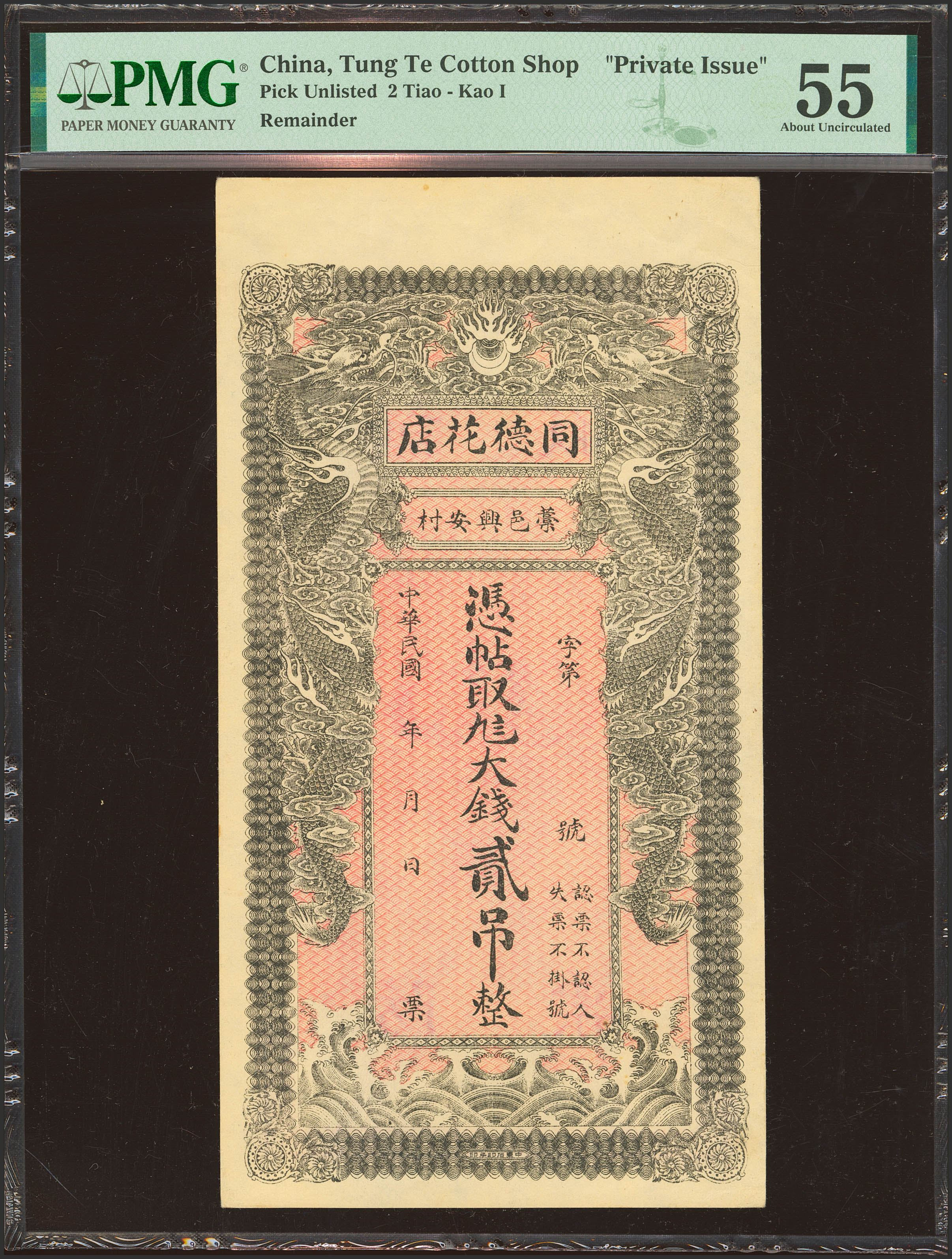 CHINA. 2 Tiao. No Date. Tong De Hua Dian. Private Issue. (Pick: Unlisted). PMG55.