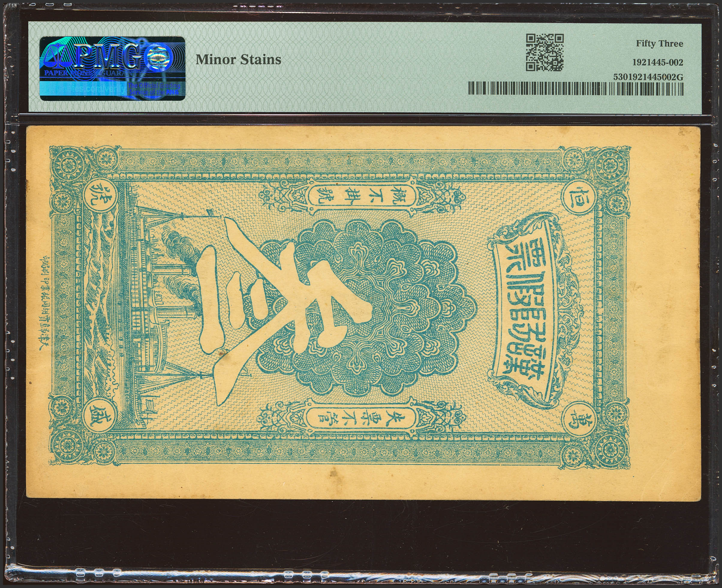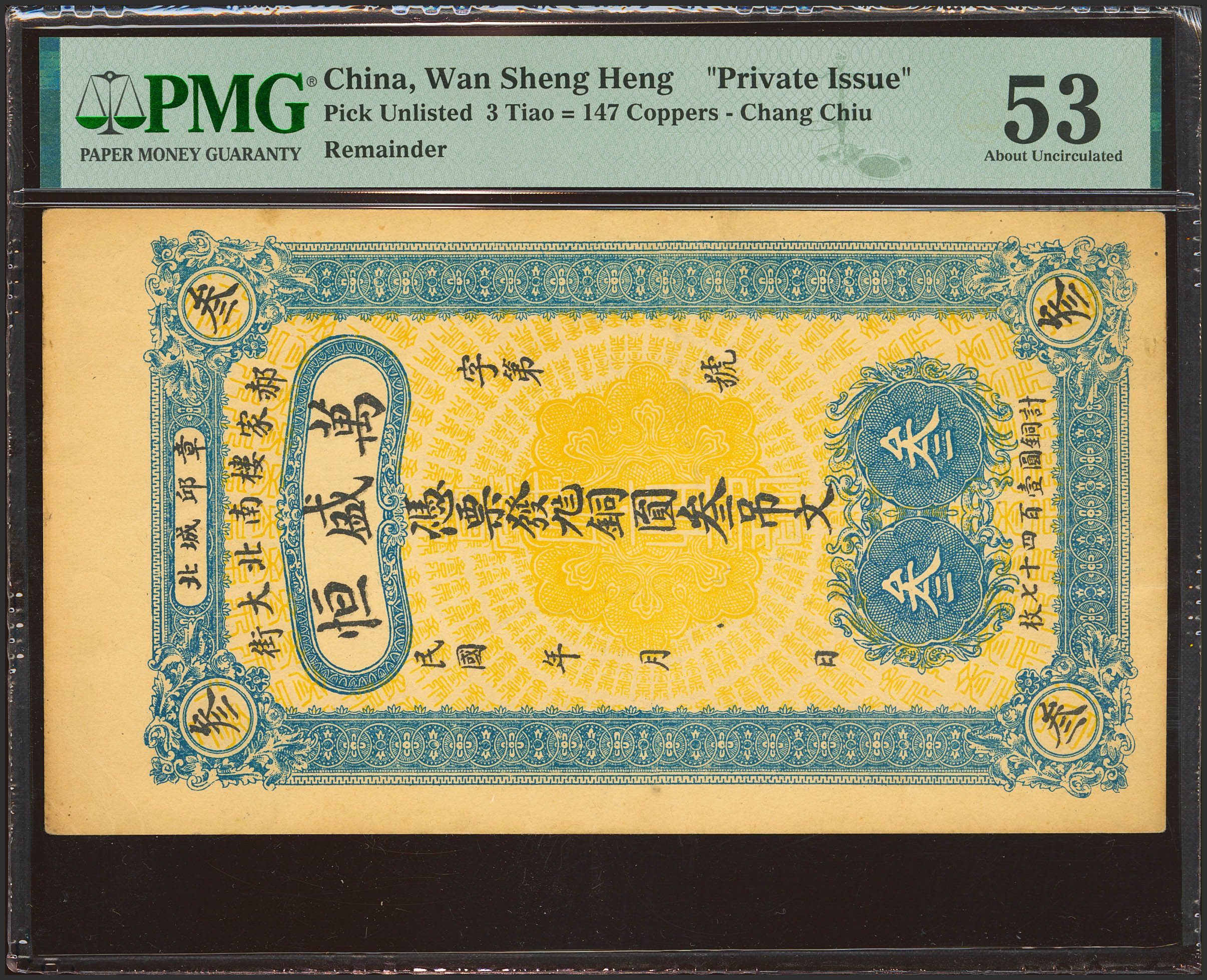 CHINA. 3 Tiao. No Date. Wan Shong Heng. Private Issue. (Pick: Unlisted). PMG53 (minor stains).
