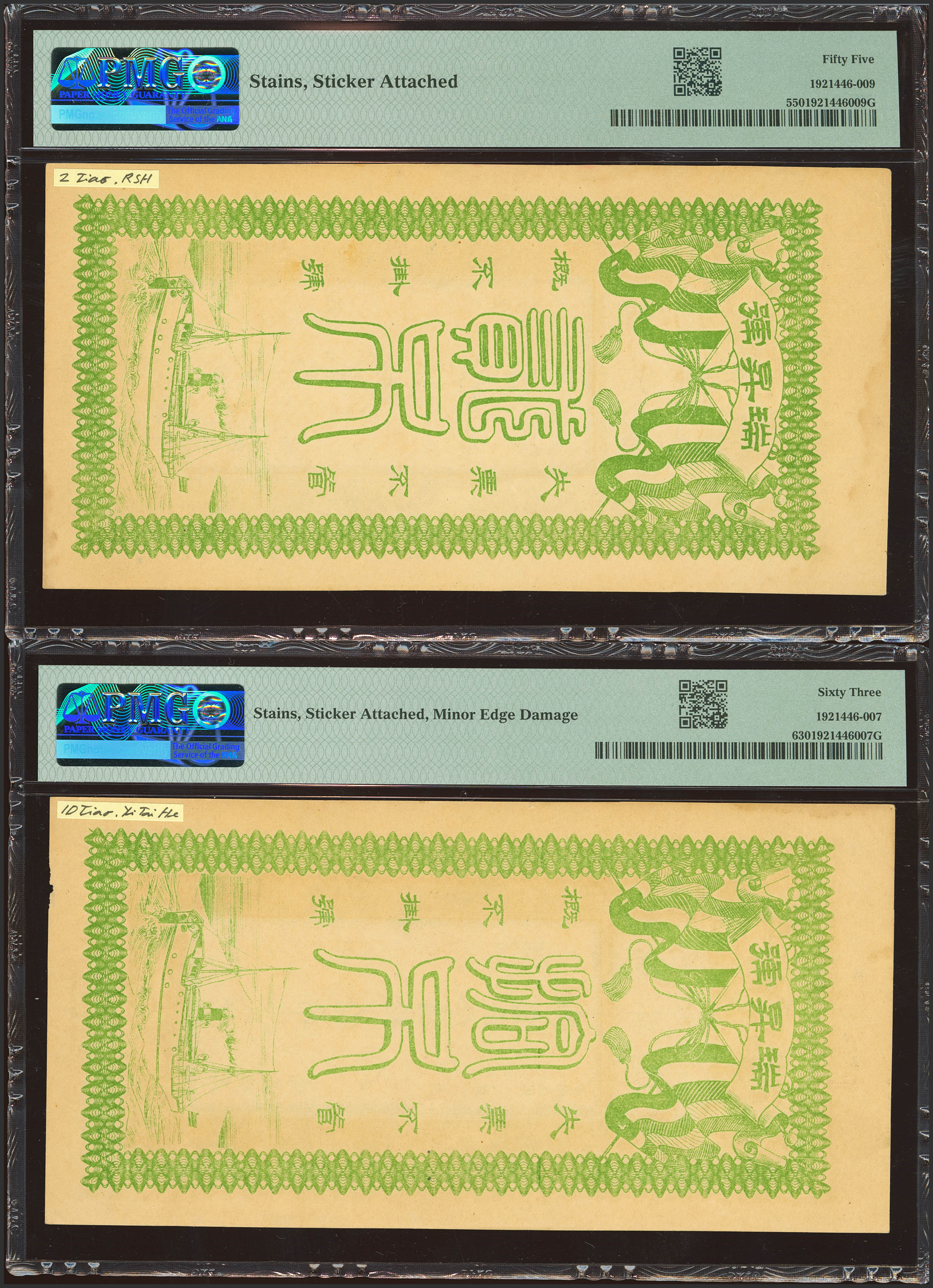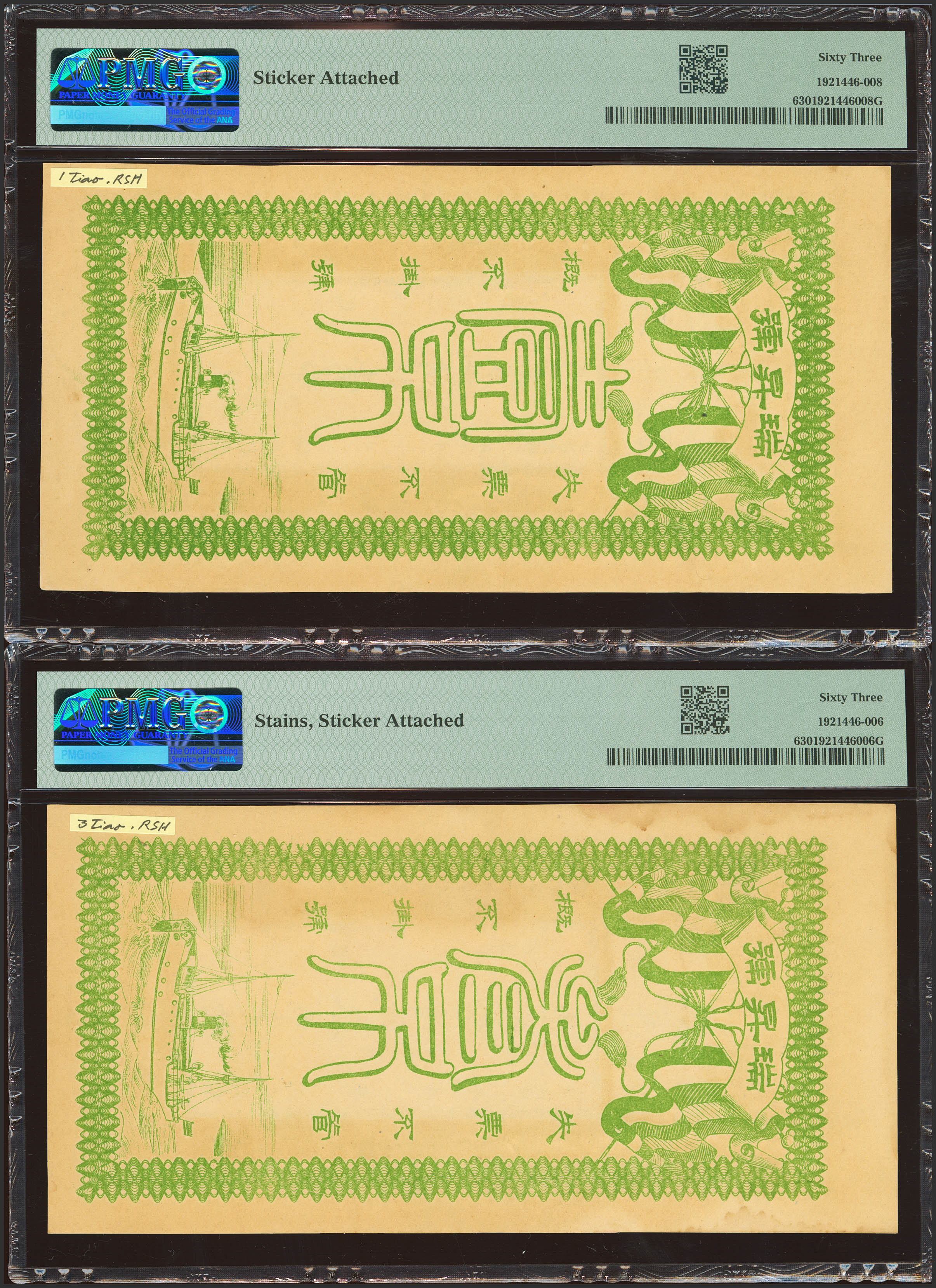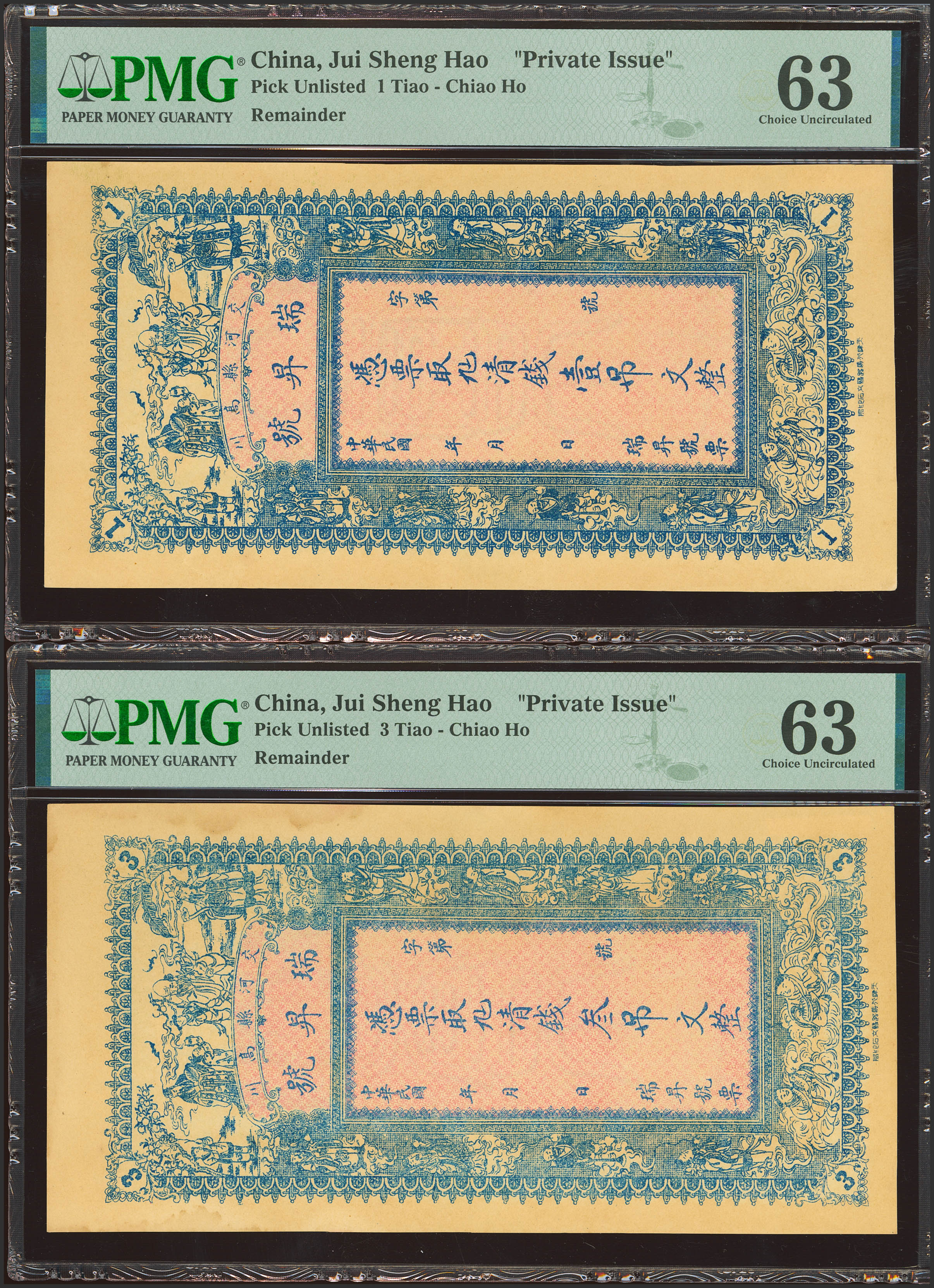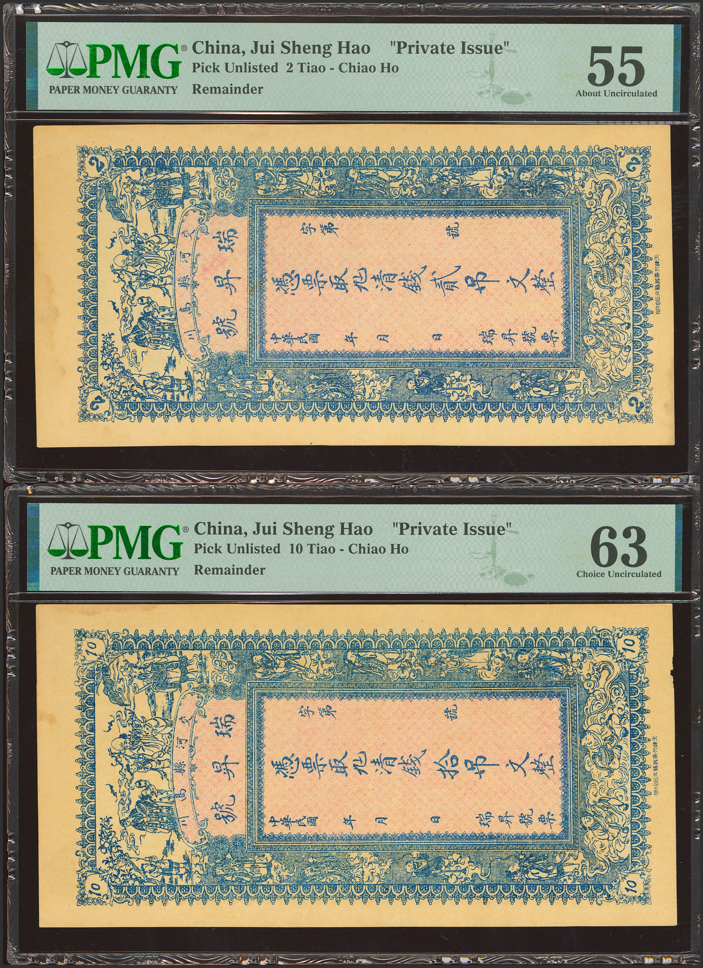 CHINA. Lot of 4 notes of 1, 2, 3 and 10 Tiao. No Date. Rui Sheng Hao. Private Issue. (Pick: Unlisted). PMG63 (three) / 55 (one).