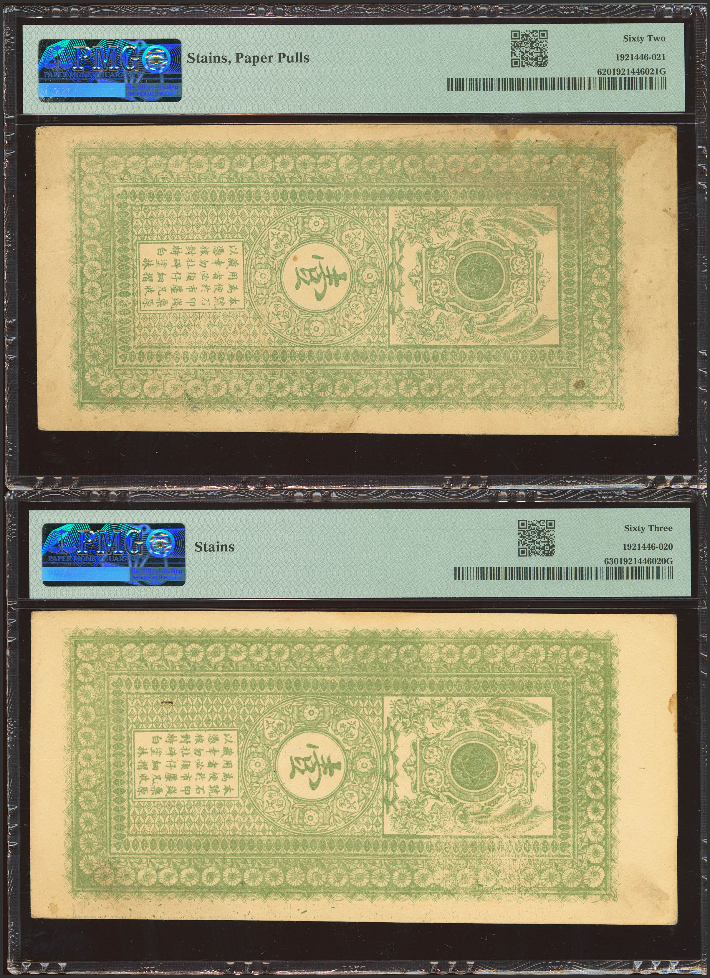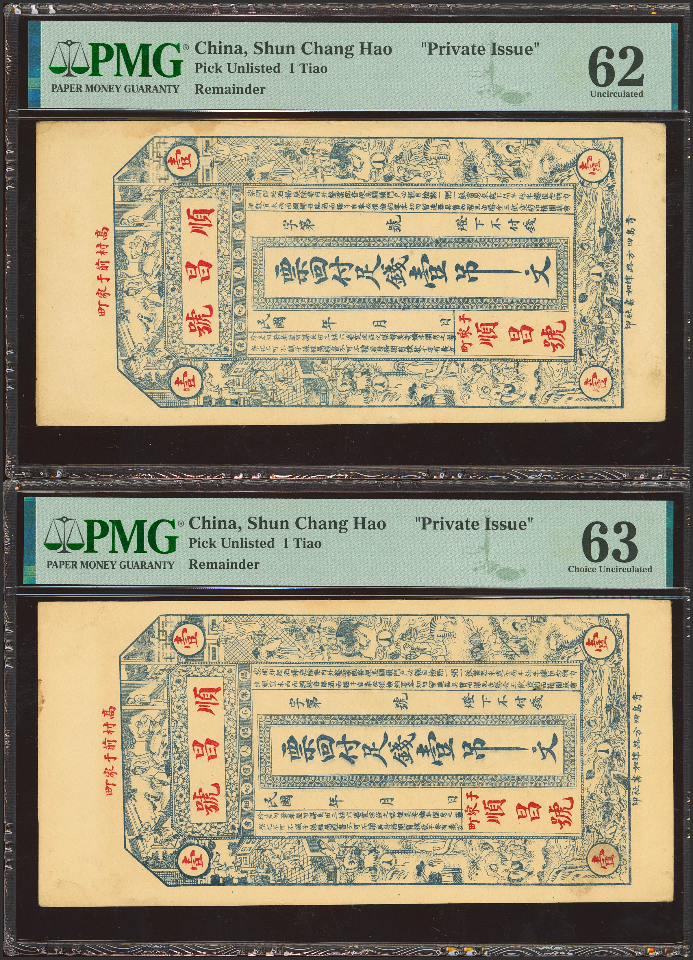 CHINA. Lot of 2 notes of 1 Tiao. No Date. Shun Chang Hao. Private Issue. (Pick: Unlisted). PMG63 (stains) / 62 (stains, paper pull).