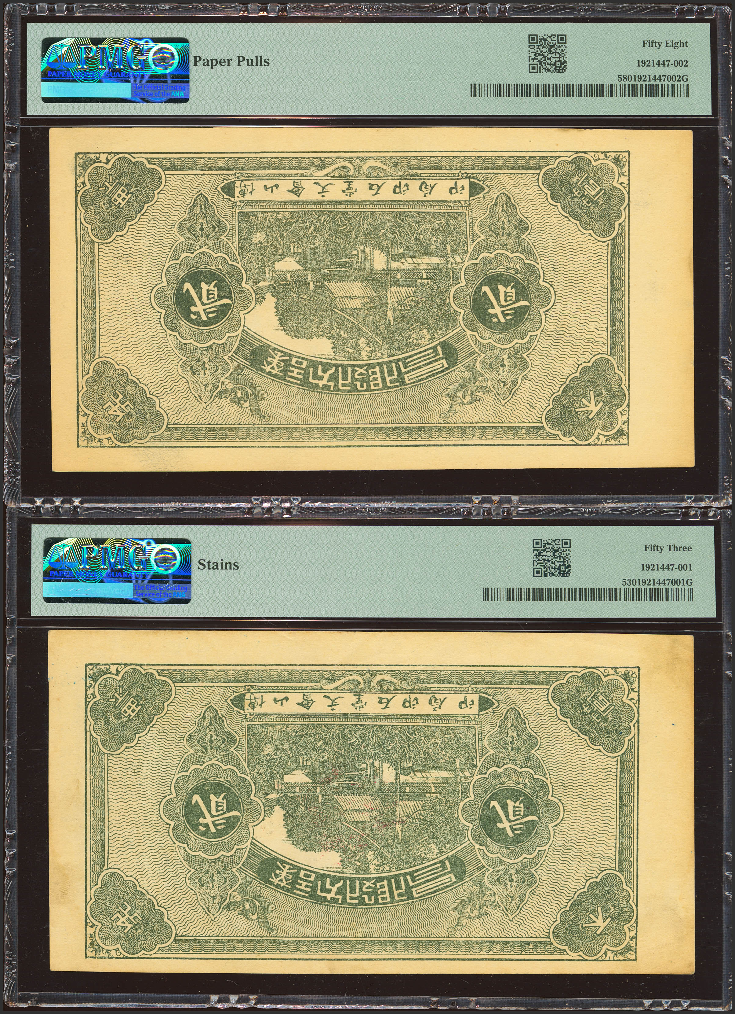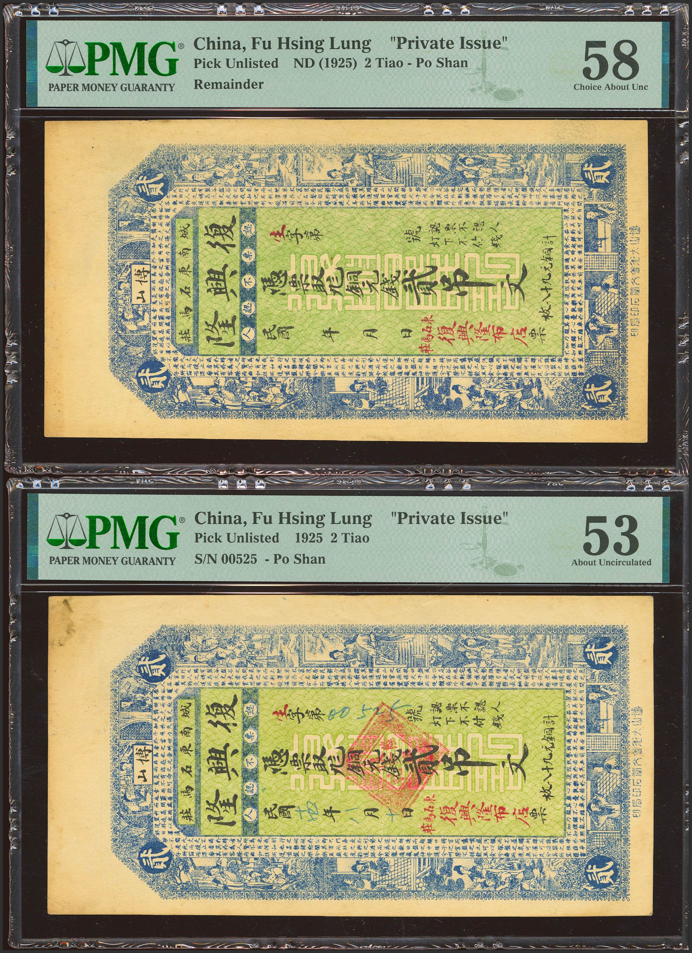 CHINA. Lot of 2 notes of 2 Tiao. 1925. Fu Xing Lu. Private Issue. Issued and remainder. (Pick: Unlisted). PMG53 (stains) / 58 (paper pulls).