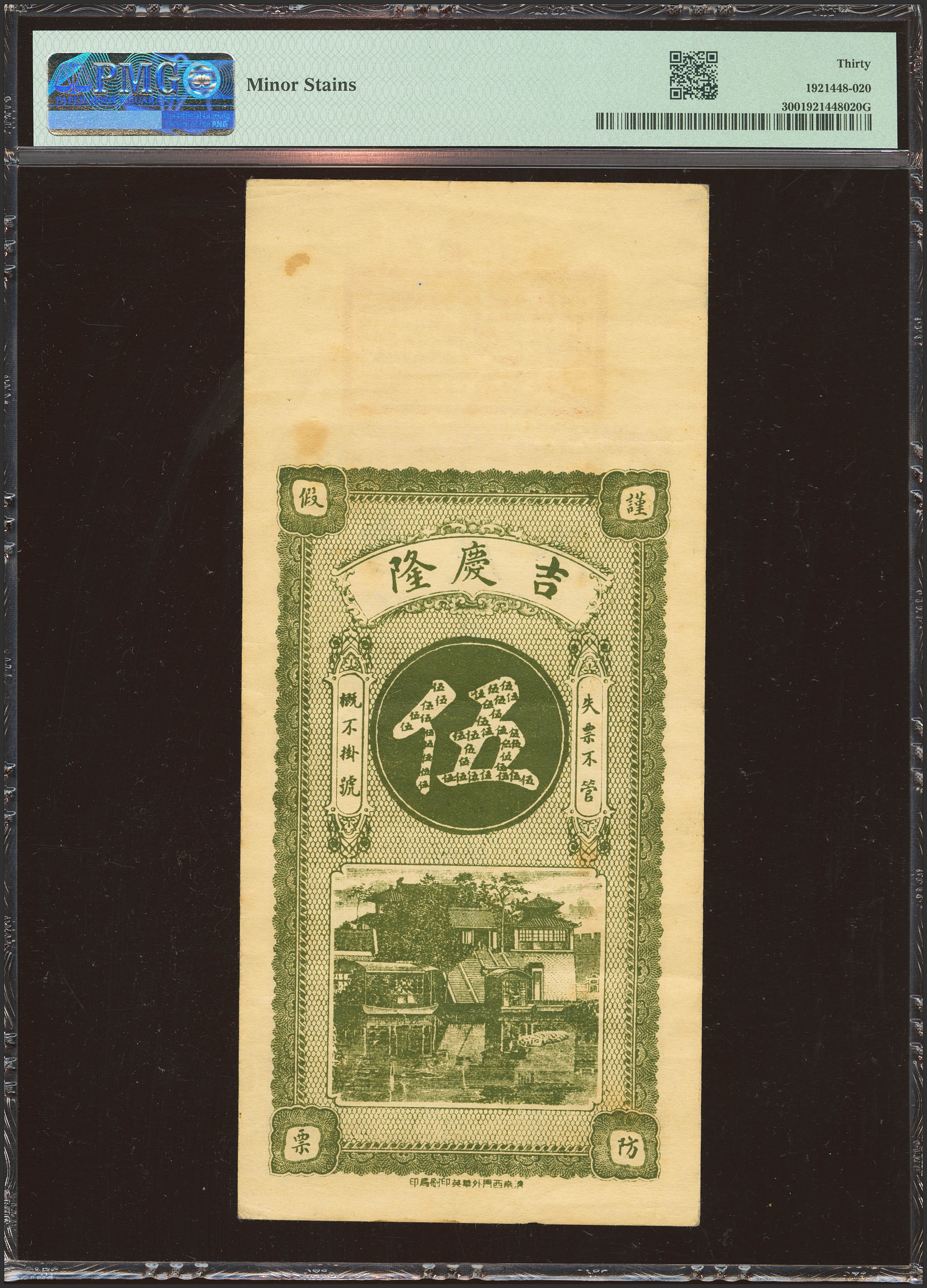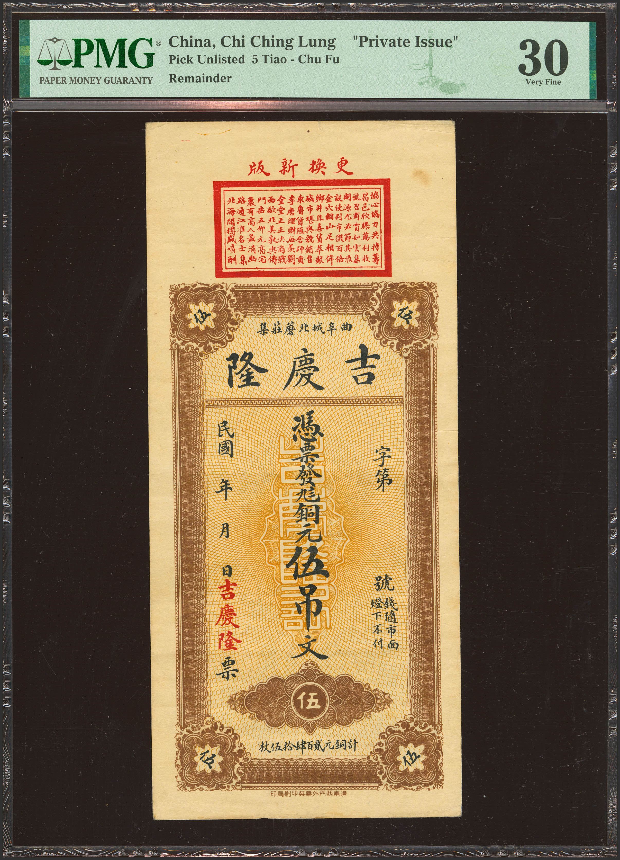 CHINA. 5 Tiao. No Date. Ji Qing Long. Private Issue. (Pick: Unlisted). PMG30 (minor stains).
