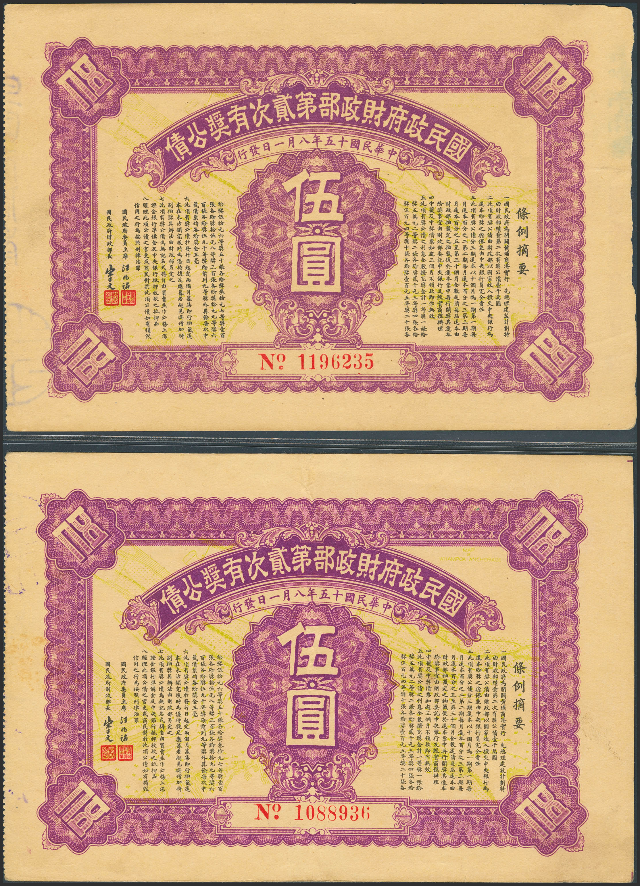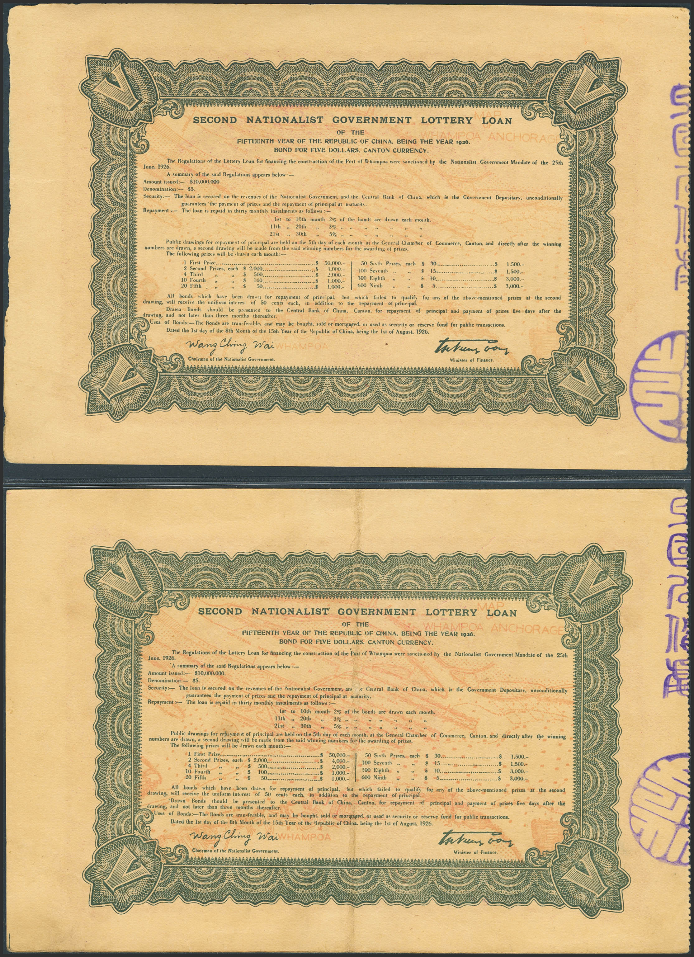 CHINA-BONDS. Lot of 2 notes of 5 Yuan. 1926. Second Nationalist Government Lottery Loan. (Pick: Unlisted, S/M: K101). Minor handling marks. Almost Uncirculated and Less than Uncirculated.