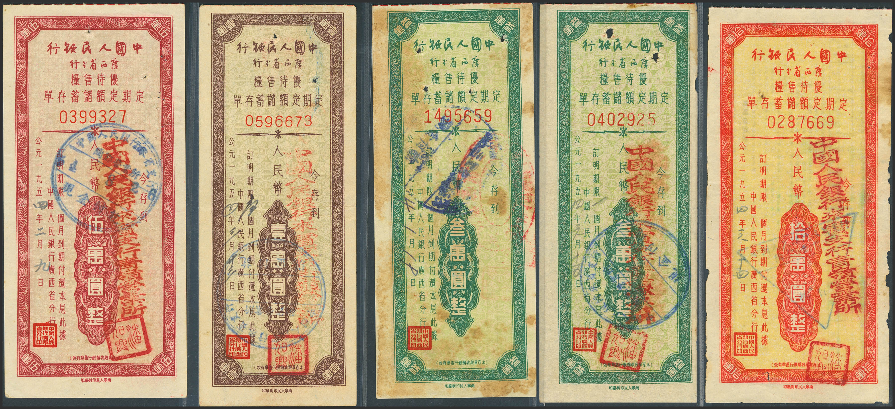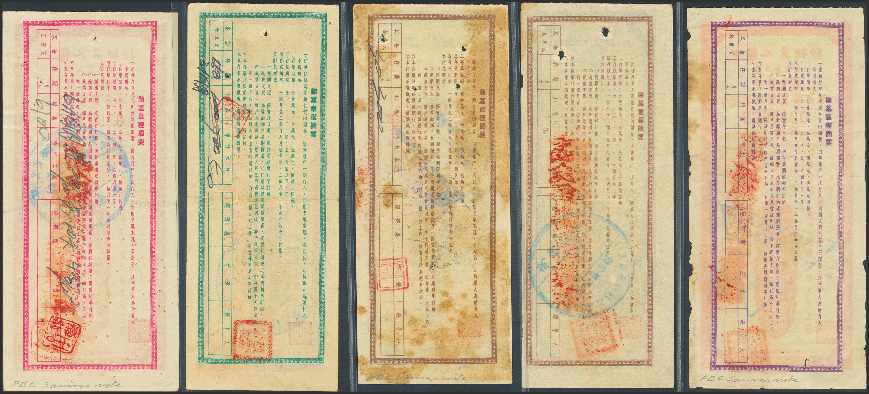 CHINA-BONDS. Lot of 5 notes. (1952ca). People’s Bank of China. Guangxi. Saving Bonds. (Pick: Unlisted). Pinholes and perforated. Very Fine to Extra Fine.