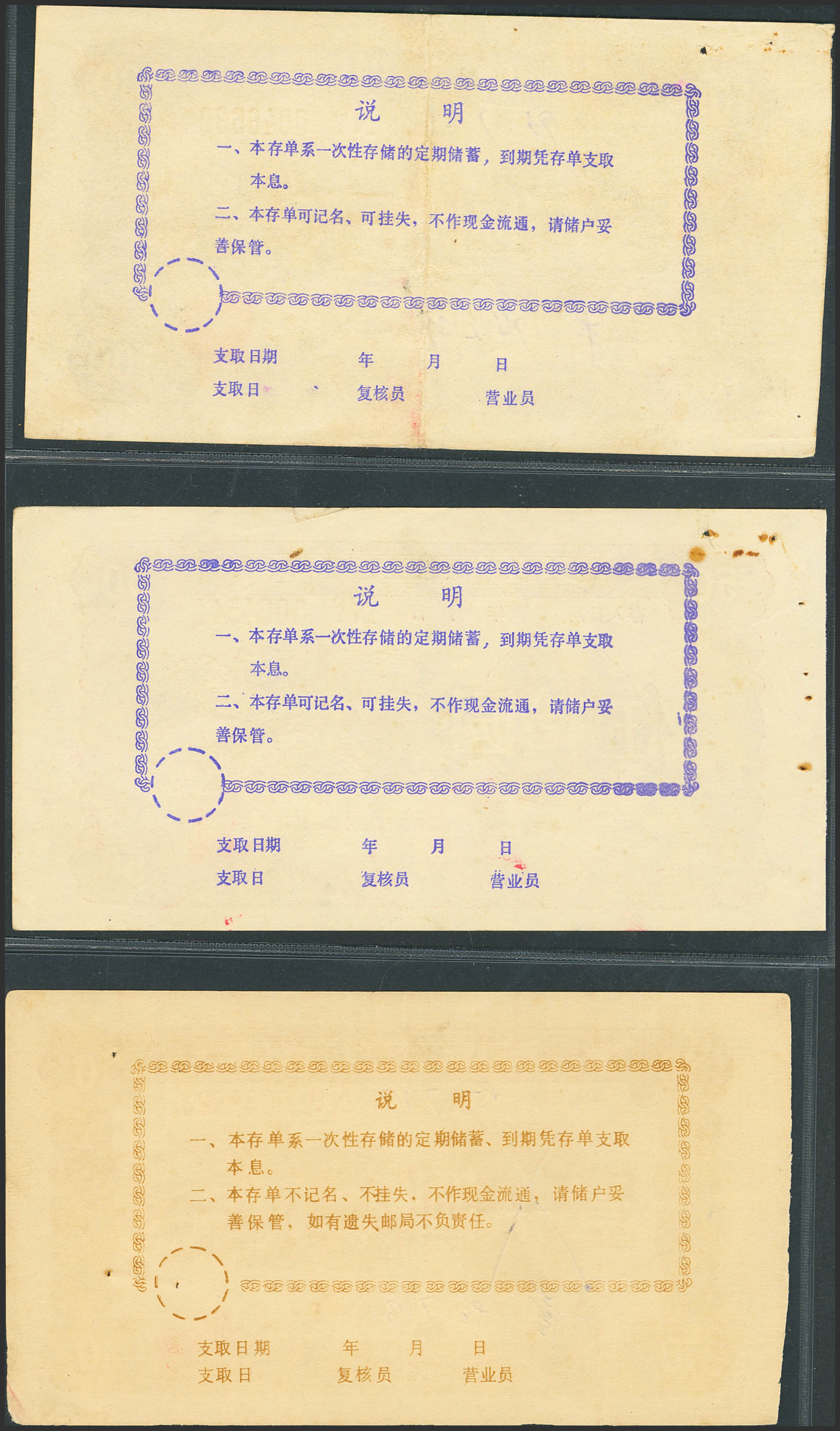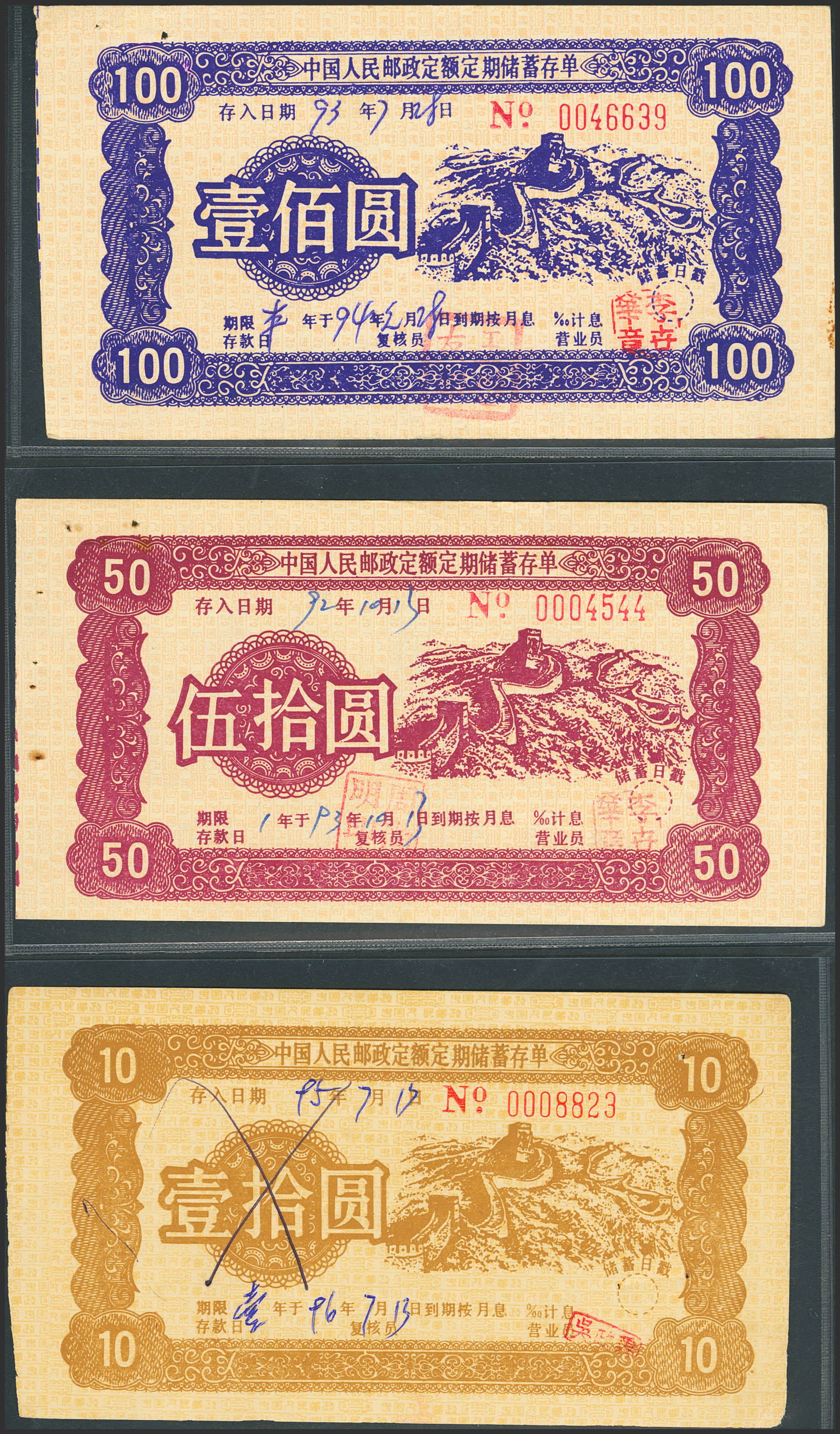 CHINA-BONDS. Lot of 3 notes of 10, 50 and 100 Yuan. No Date. Postal Savings Bank of China. Saving Bonds. (Pick: Unlisted). Almost Uncirculated and Less than Uncirculated.