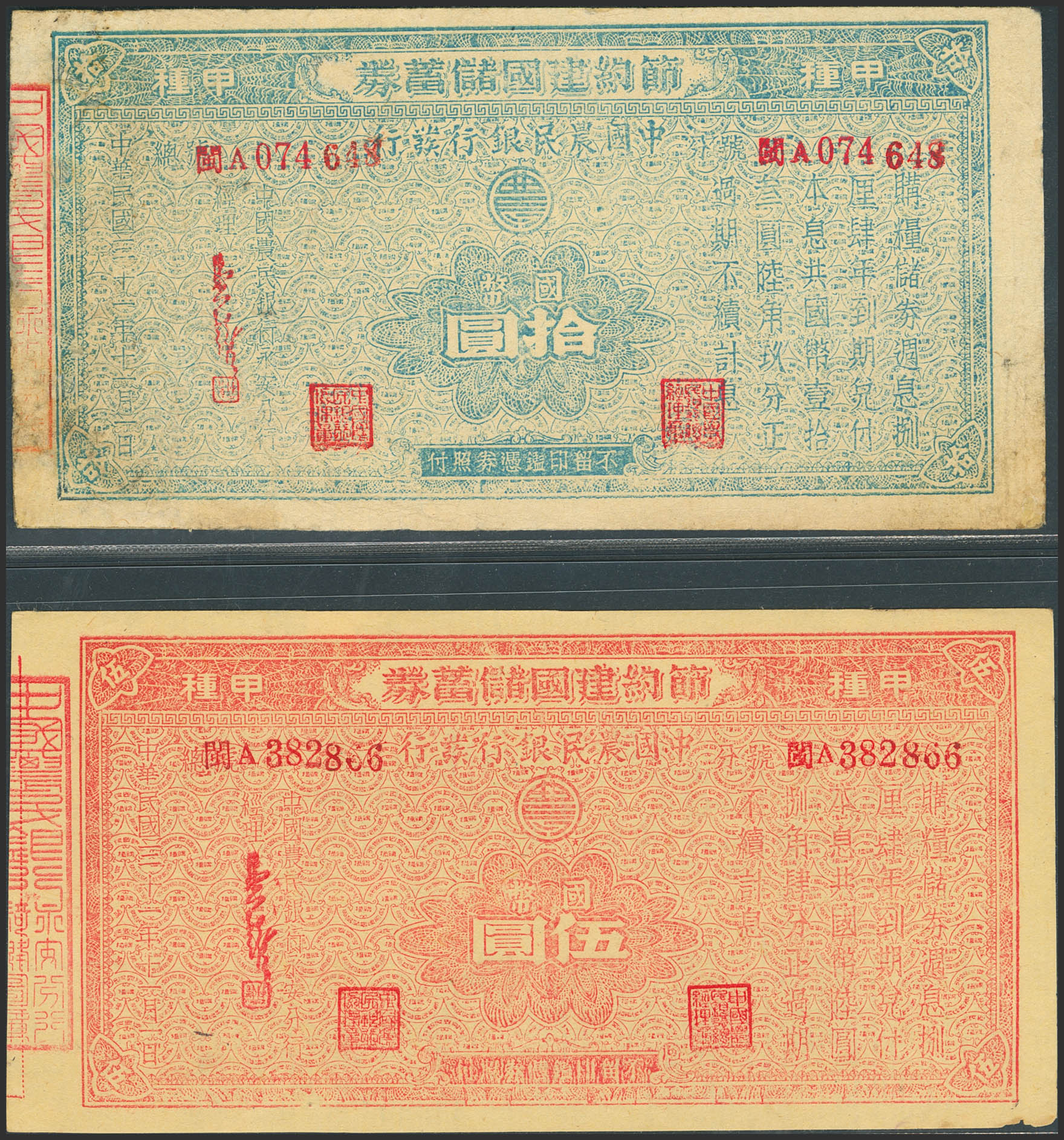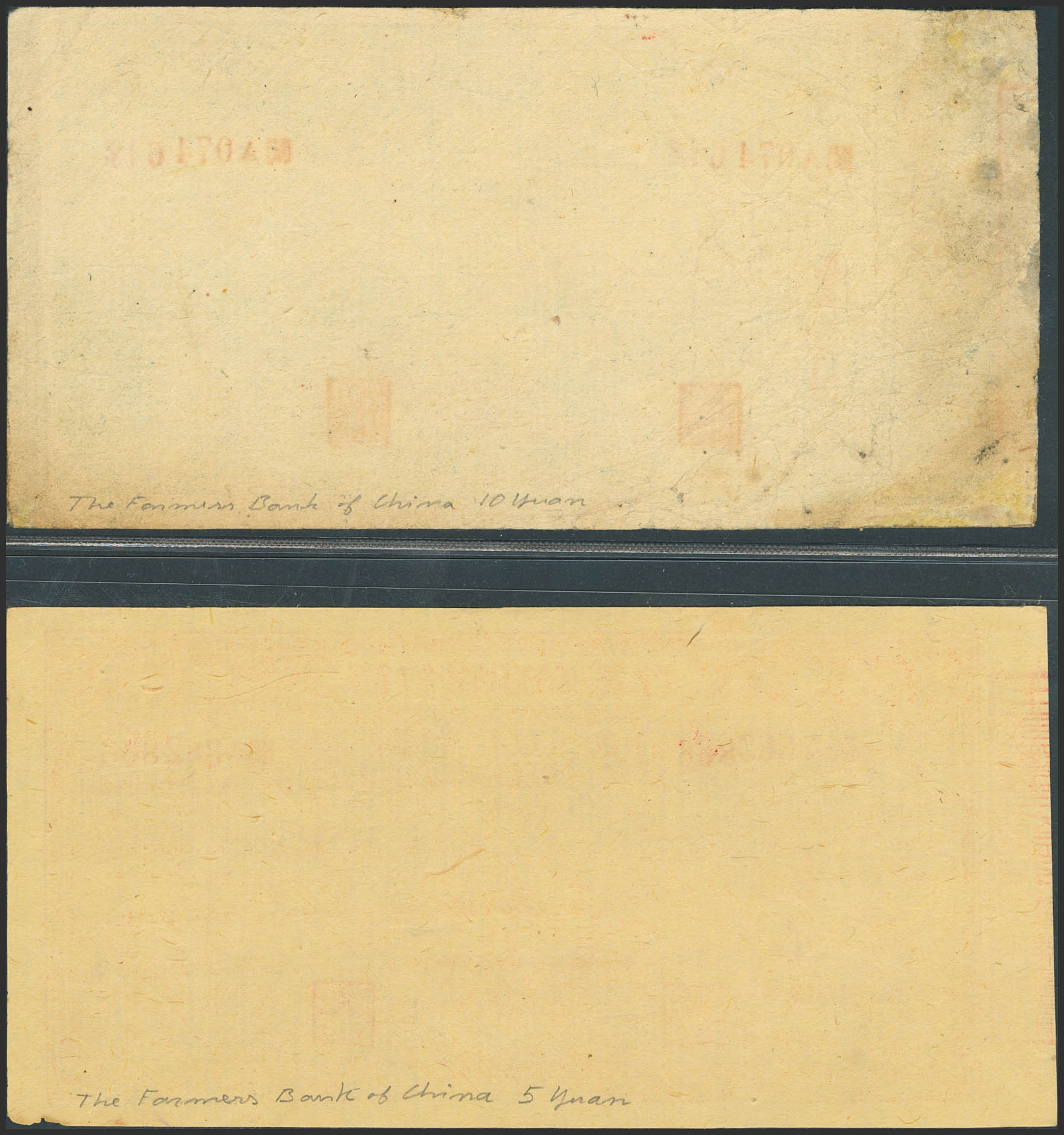 CHINA-BONDS. Lot of 2 notes of 5 and 10 Yuan. No Date. Farmers Bank. Private Issue. (Pick: Unlisted). Restored. Fine to Very Fine.
