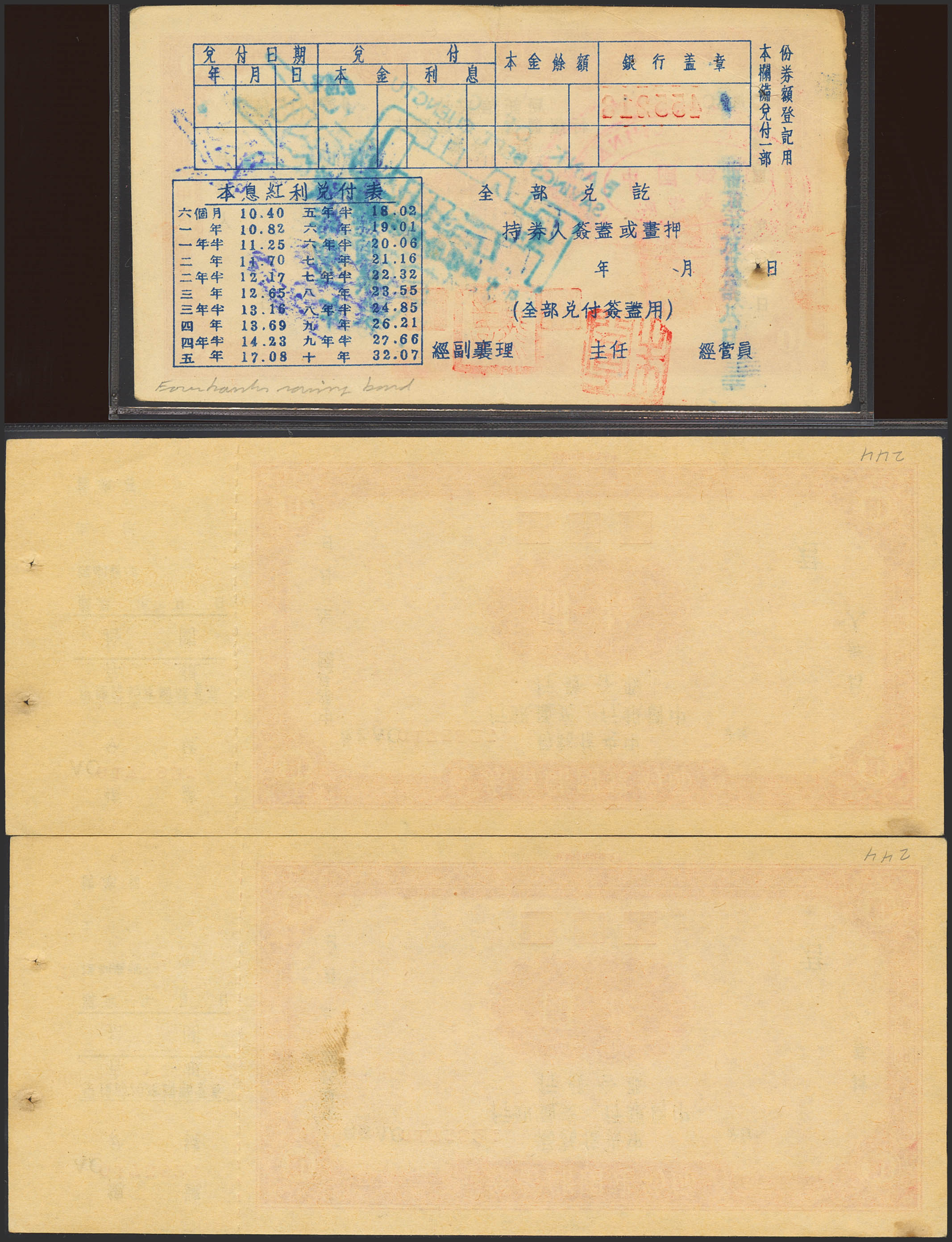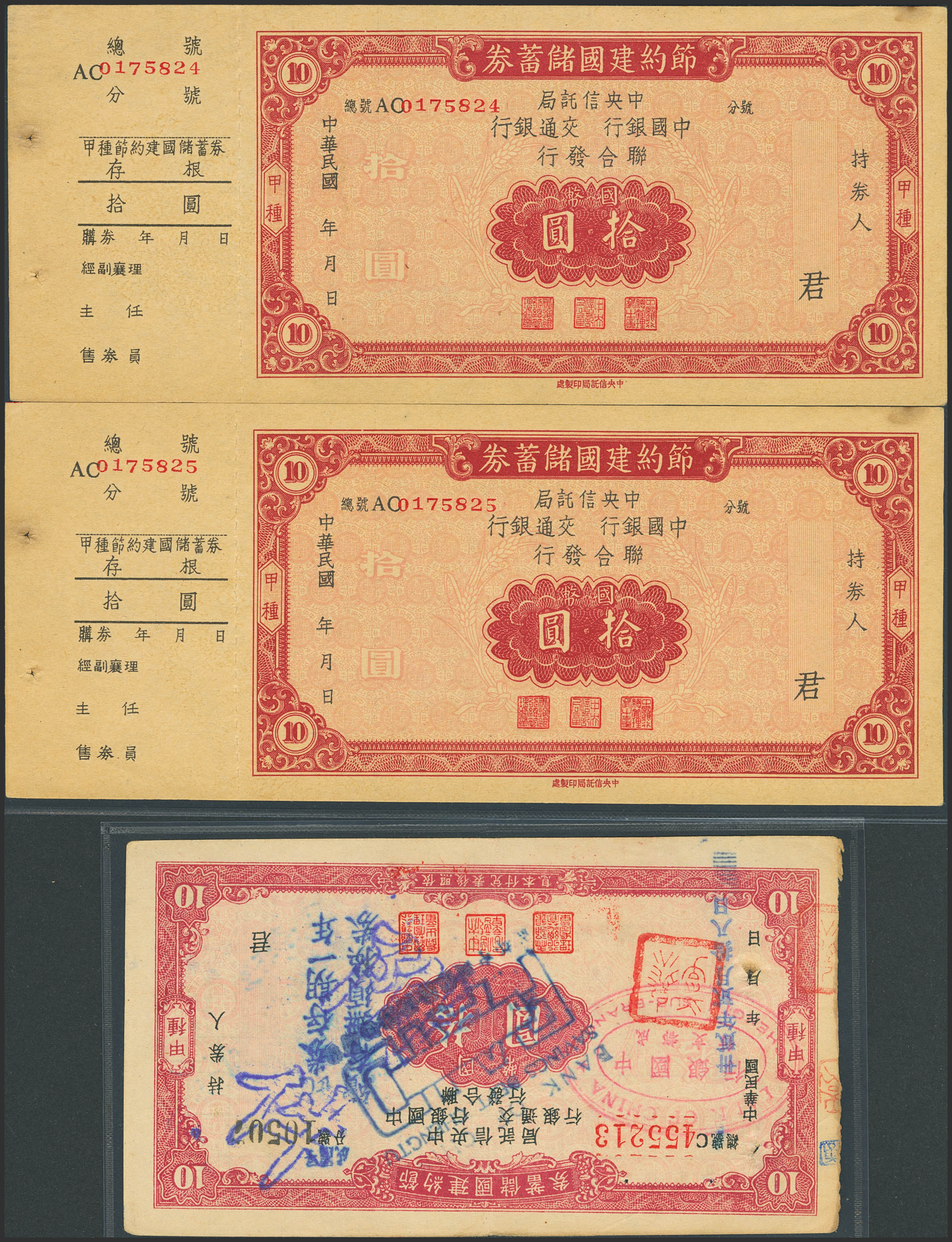 CHINA-BONDS. Lot of 3 notes of 10 Yuan. No Date. Central Bank of China. Saving Bonds. (Pick: Unlisted). Perforated. Very Fine to Less than uncirculated.