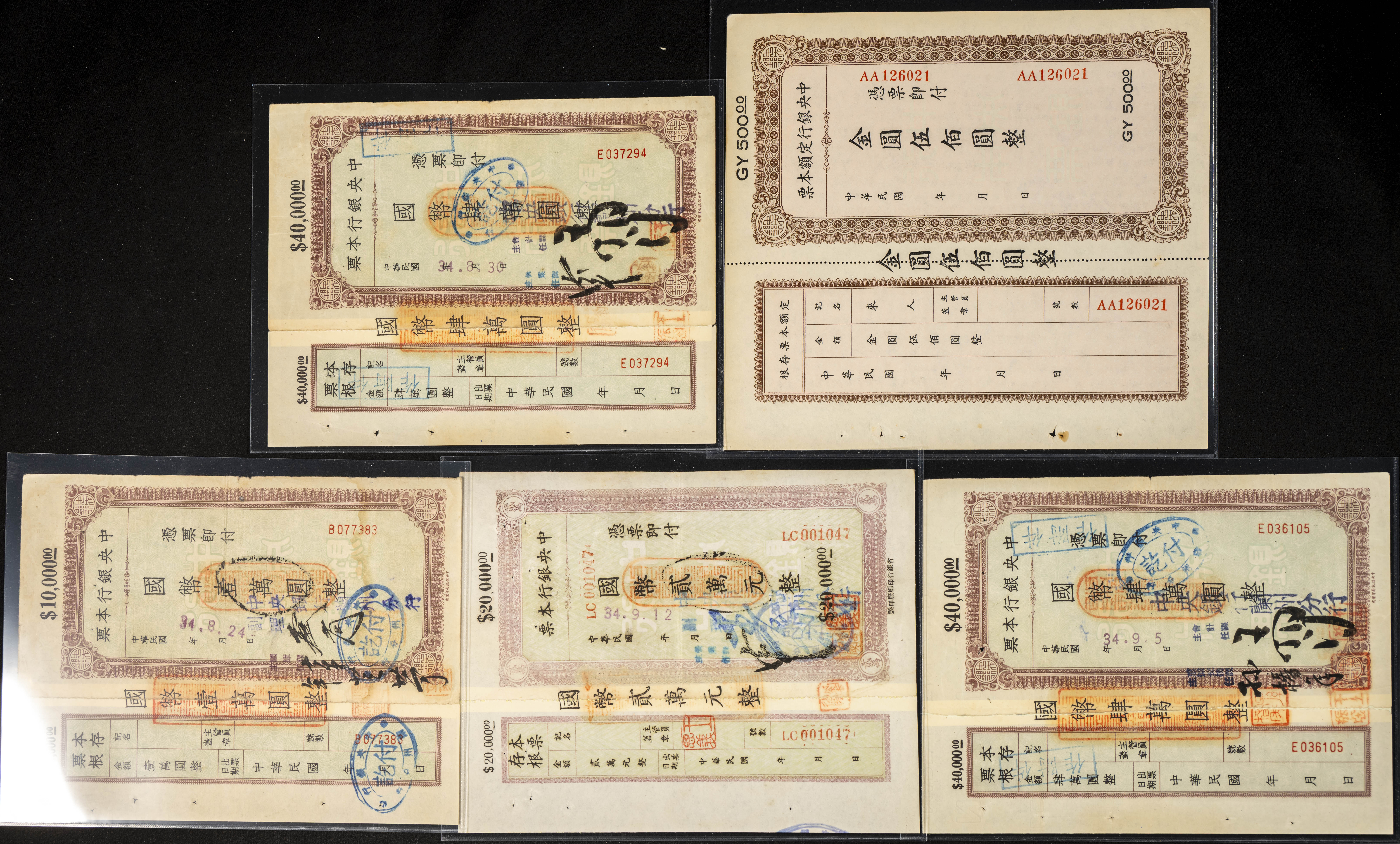 CHINA-BONDS. Lot of 5 notes of mixed denominations. No Date. Republic of China. Saving Bonds. (Pick: Unlisted). Removable adhesive tape on back. Very Fine to About Uncirculated.