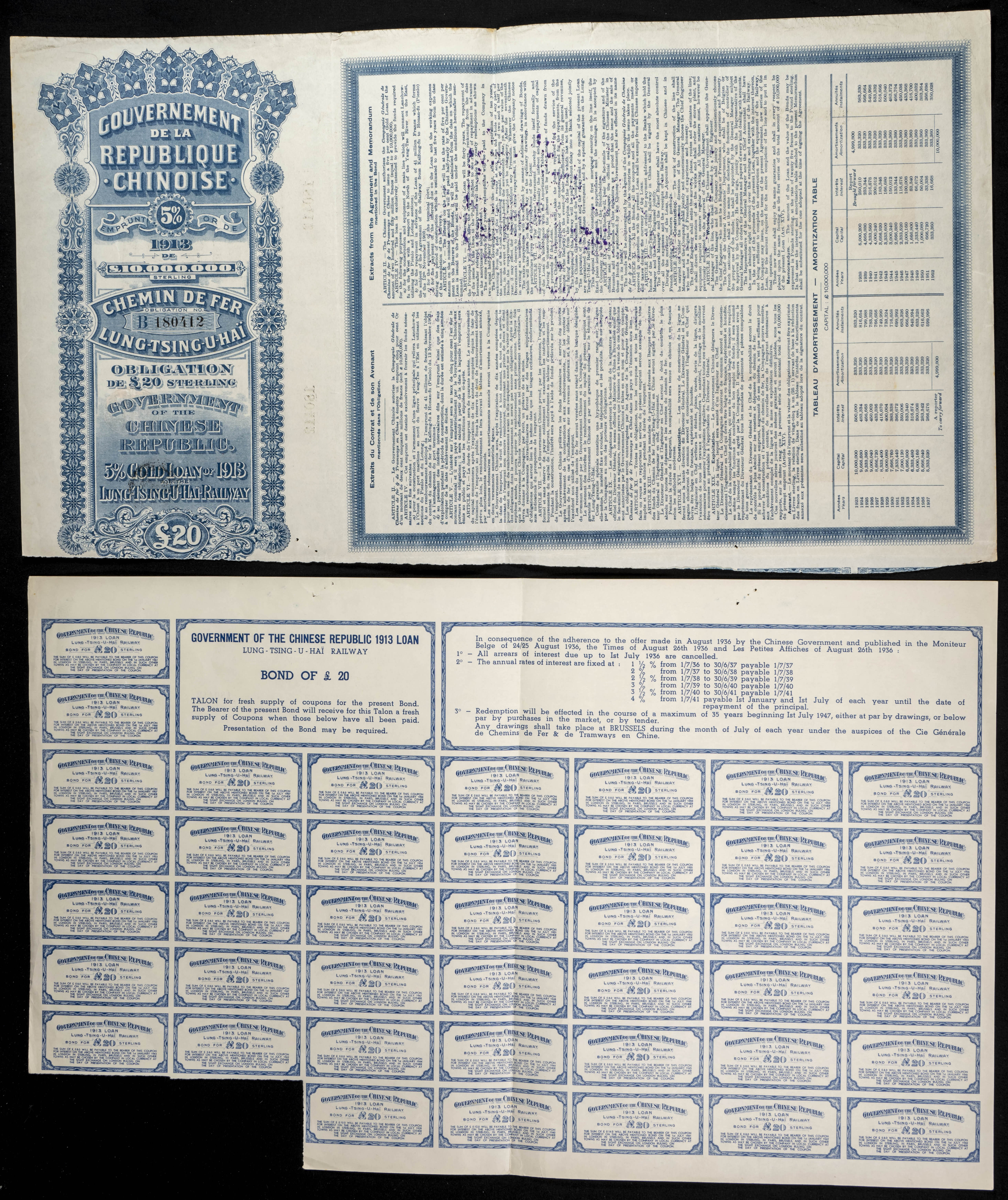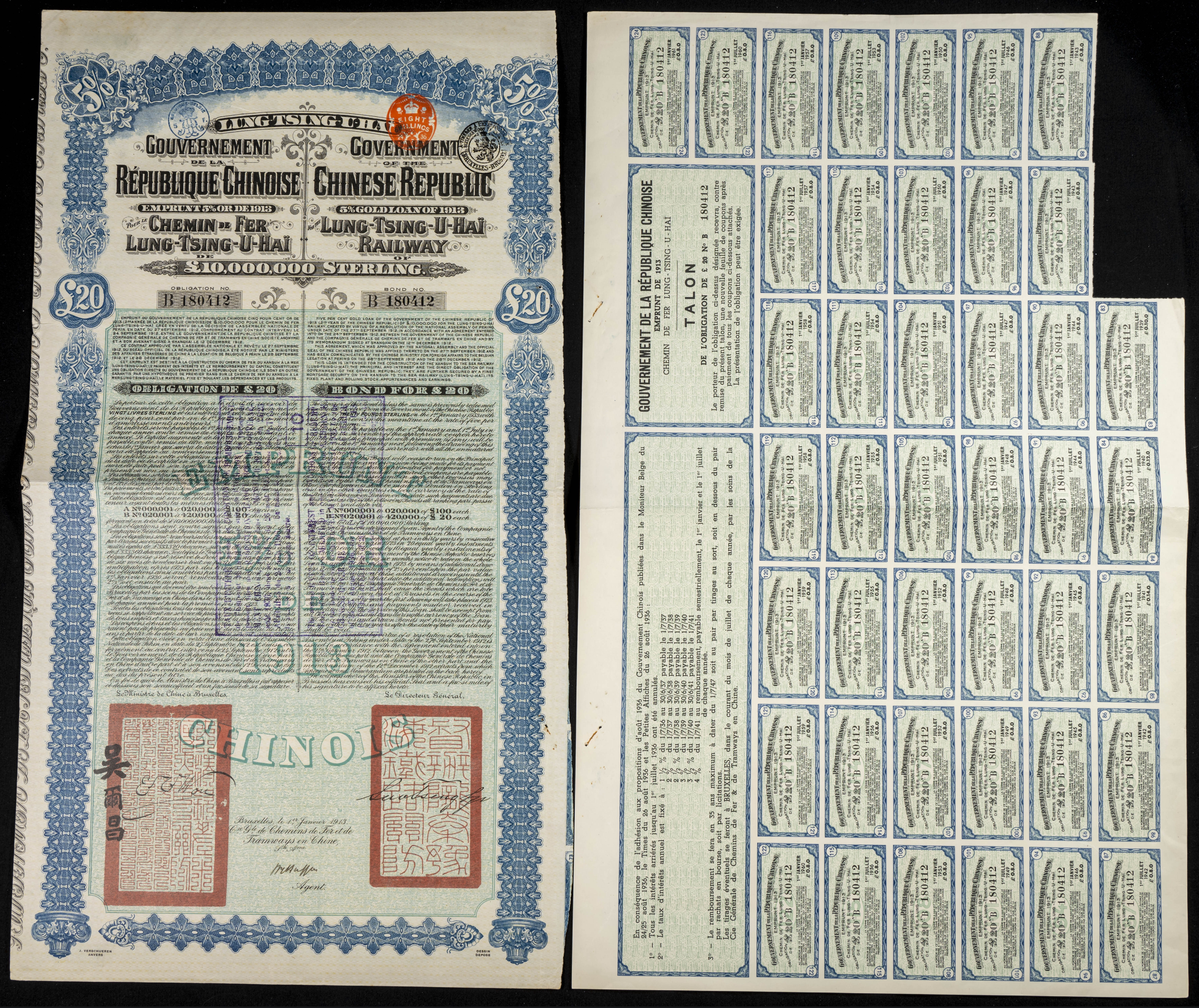 CHINA. 20 Pounds. 1913. Gouvernement de la Republique Chinoise. Chemin de Fer. Lung-Tsing-U-Hai. (Pick: Unlisted). More than Extremely Fine.