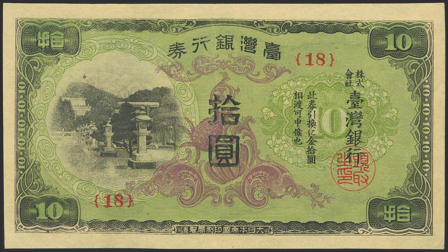 TAIWAN. 10 Yen. (1944ca). Bank of Taiwan. (Pick: 1930b). Extremely Fine.