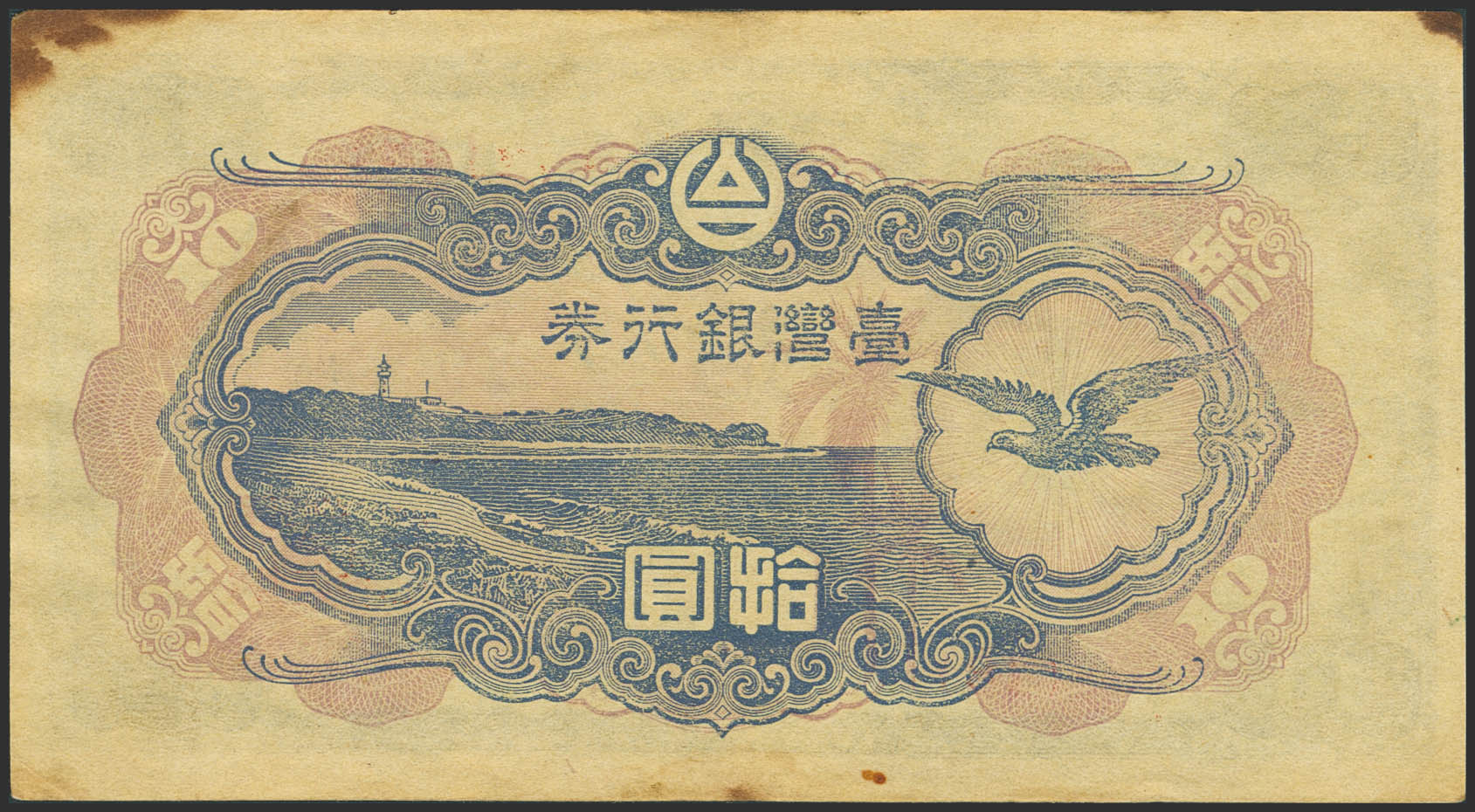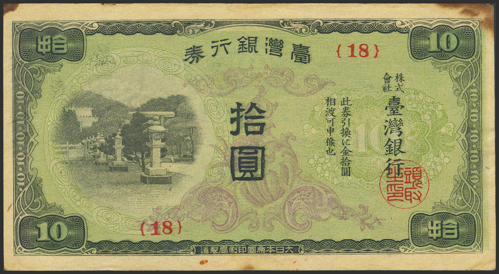 TAIWAN. 10 Yen. (1944ca). Bank of Taiwan. (Pick: 1930b). Rusty corners. More than Very Fine.