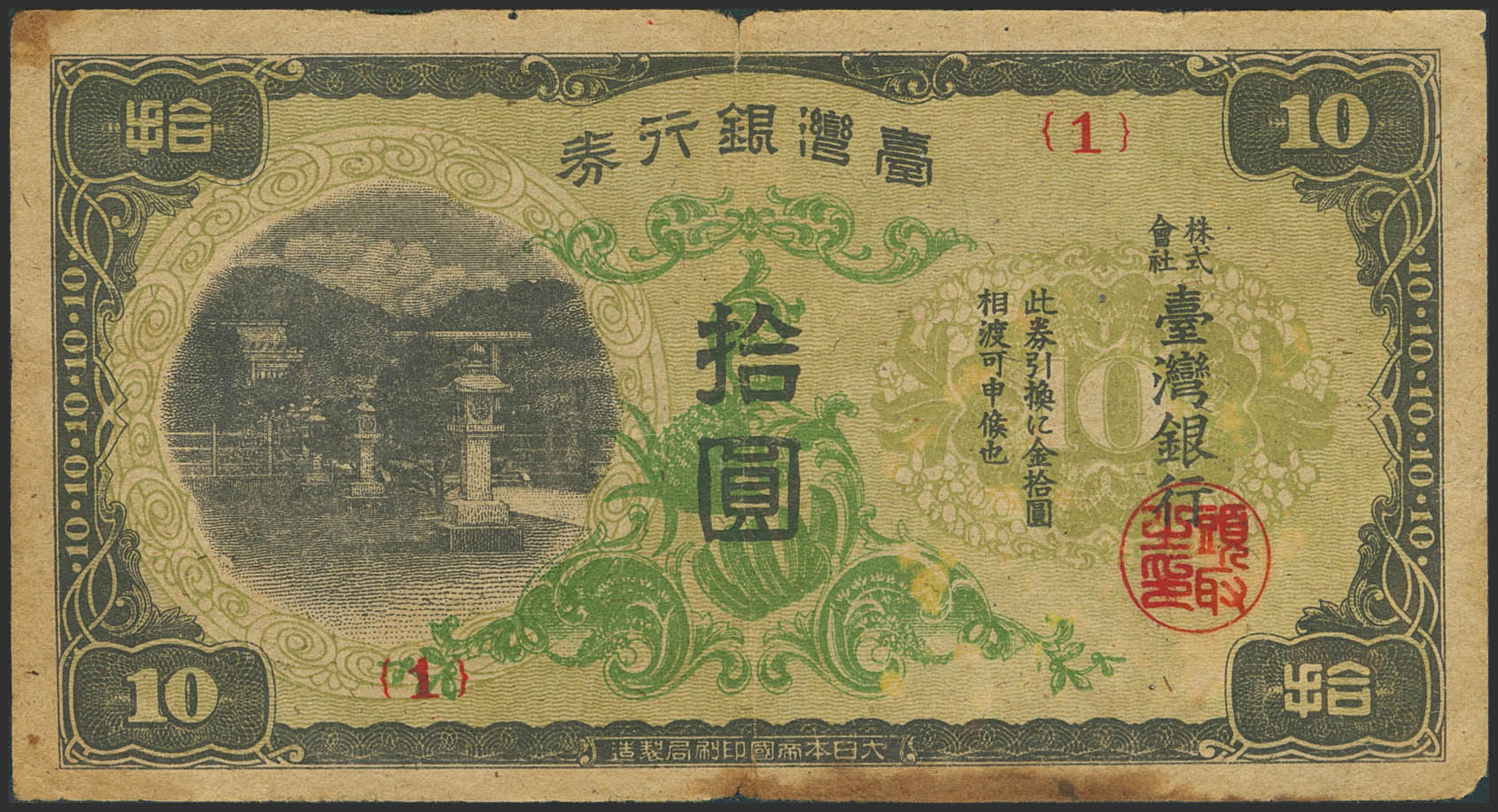 TAIWAN. 10 Yen. (1944ca). Bank of Taiwan. (Pick: 1931a). Rust. Very Fine.