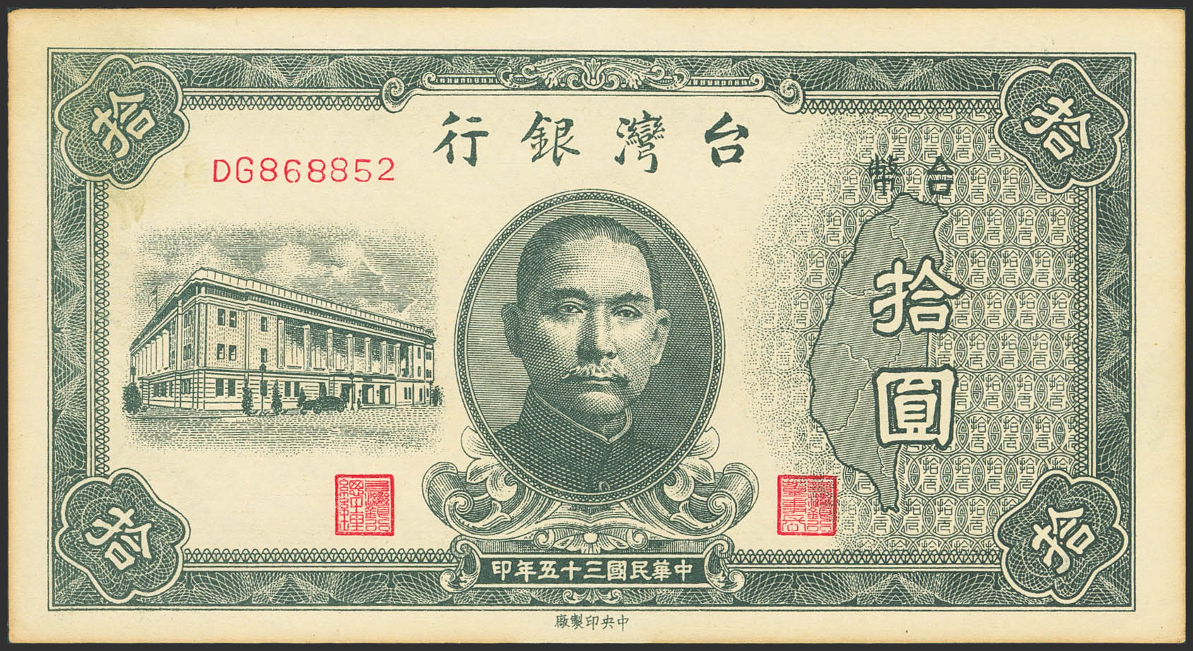 TAIWAN. 10 Yuan. 1946. Bank of Taiwan. (Pick: 1937). Less than Uncirculated.