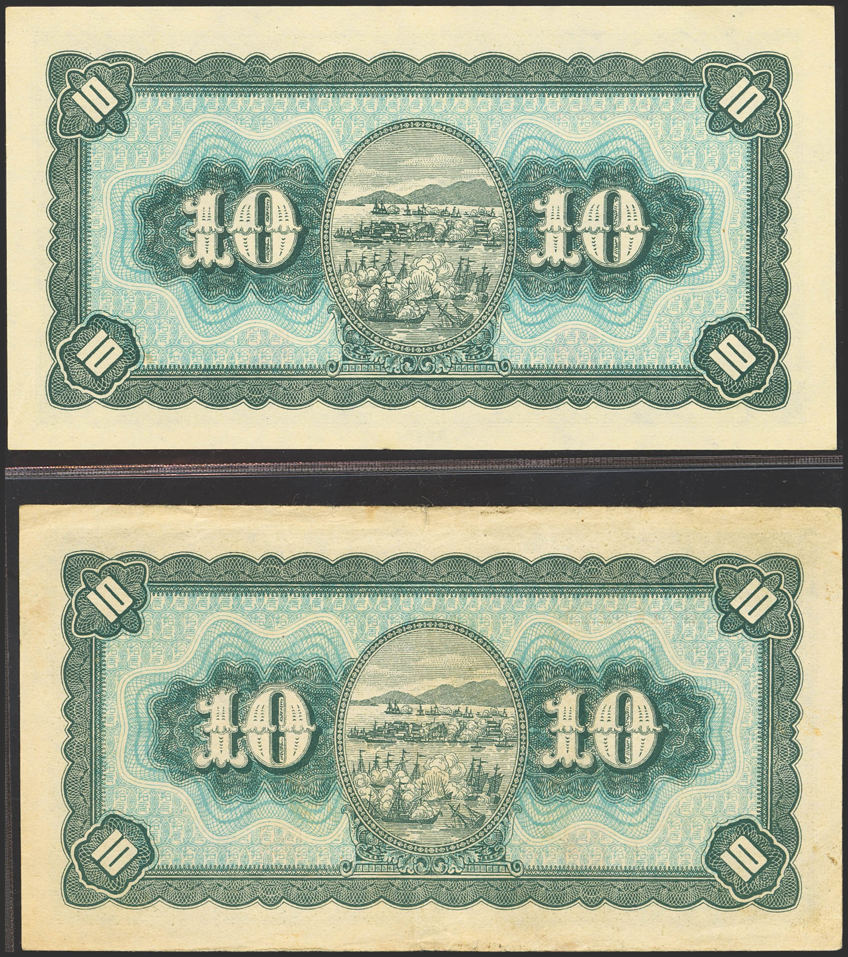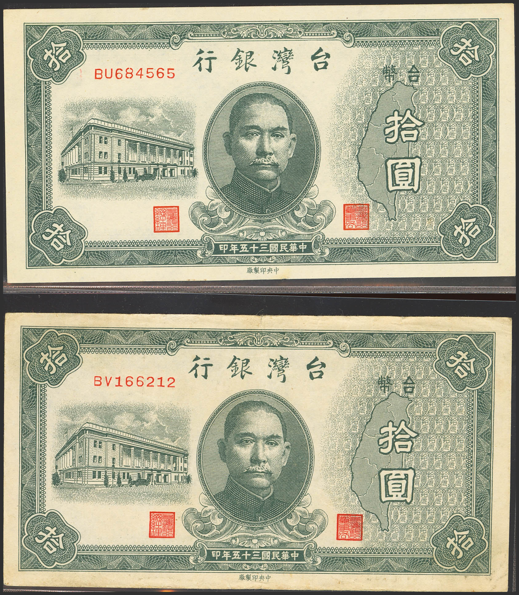 TAIWAN. Lot of 2 notes of 10 Yuan. 1946. Bank of Taiwan. (Pick: 1937). About Uncirculated and Extremely Fine.