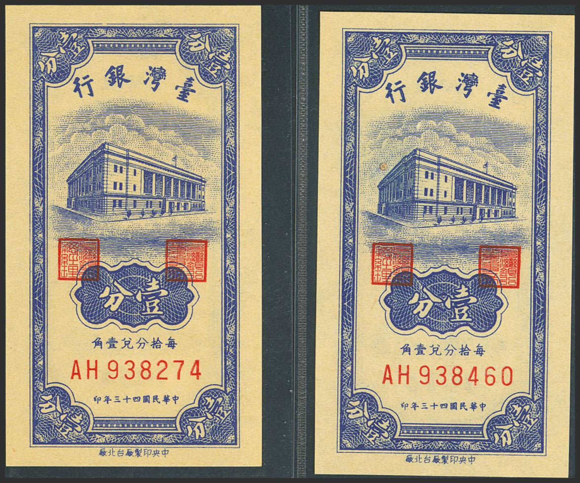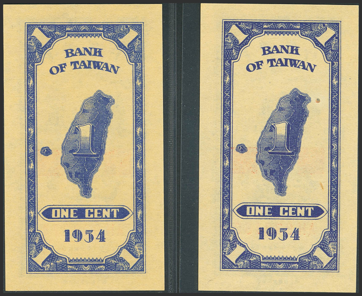 TAIWAN. Lot of 2 notes of 1 Cent. 1954. Bank of Taiwan. (Pick: 1963). Uncirculated.