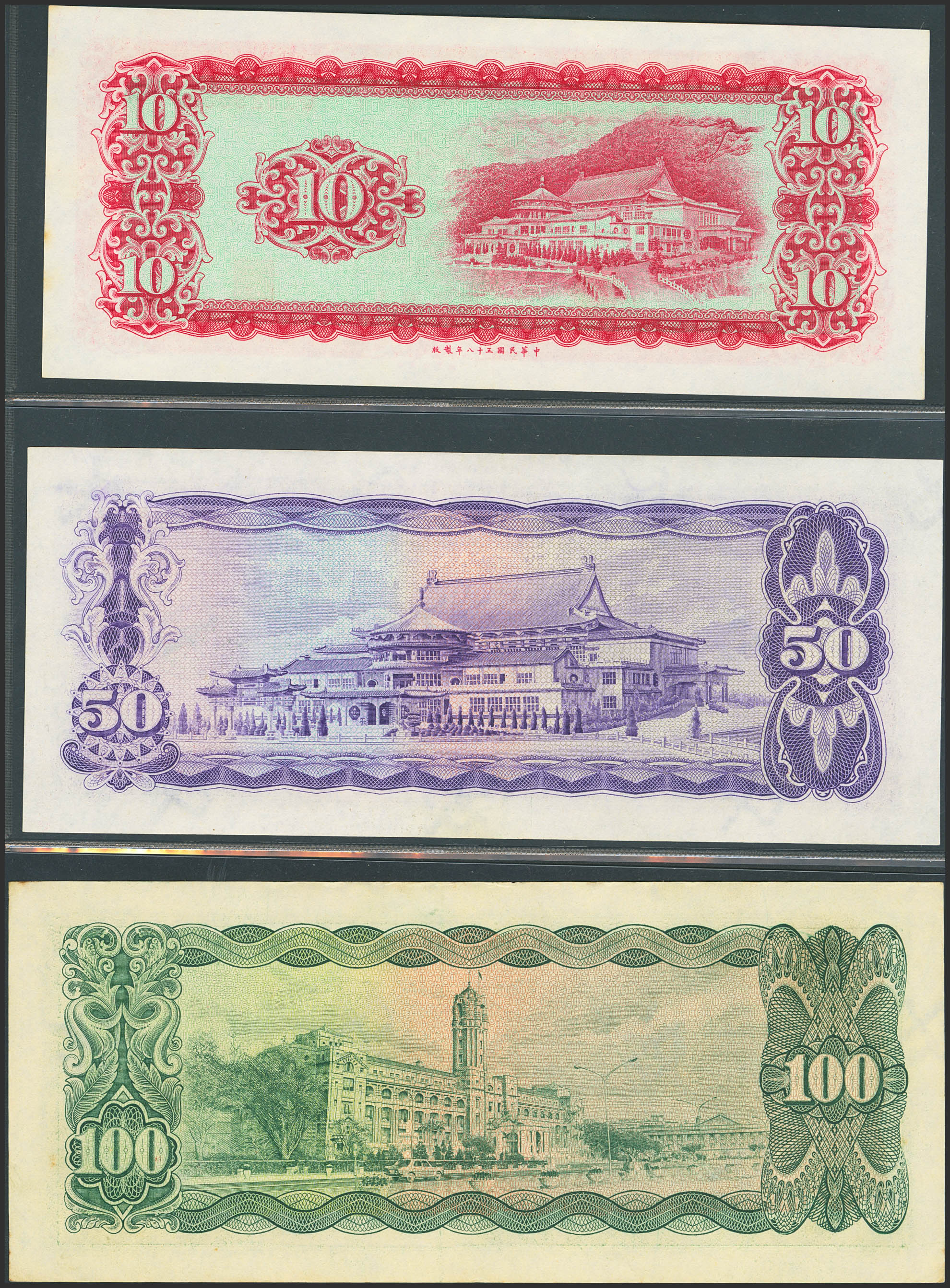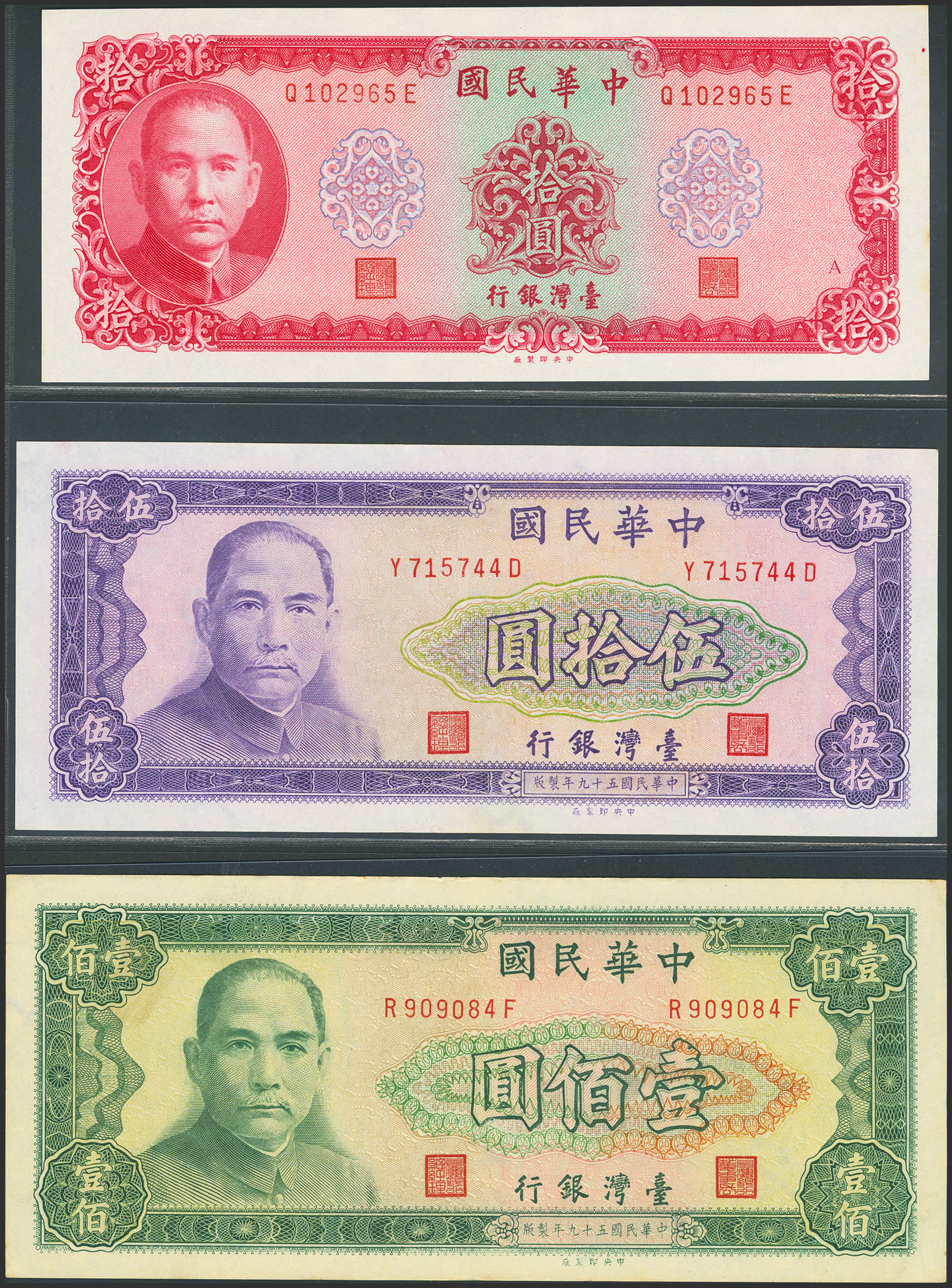 TAIWAN. Lot of 3 notes of 10, 50 and 100 Yuan. 1969 and 1970. Bank of Taiwan. (Pick: 1979, 1980 and 1981). Extra Fine to Less than Uncirculated.