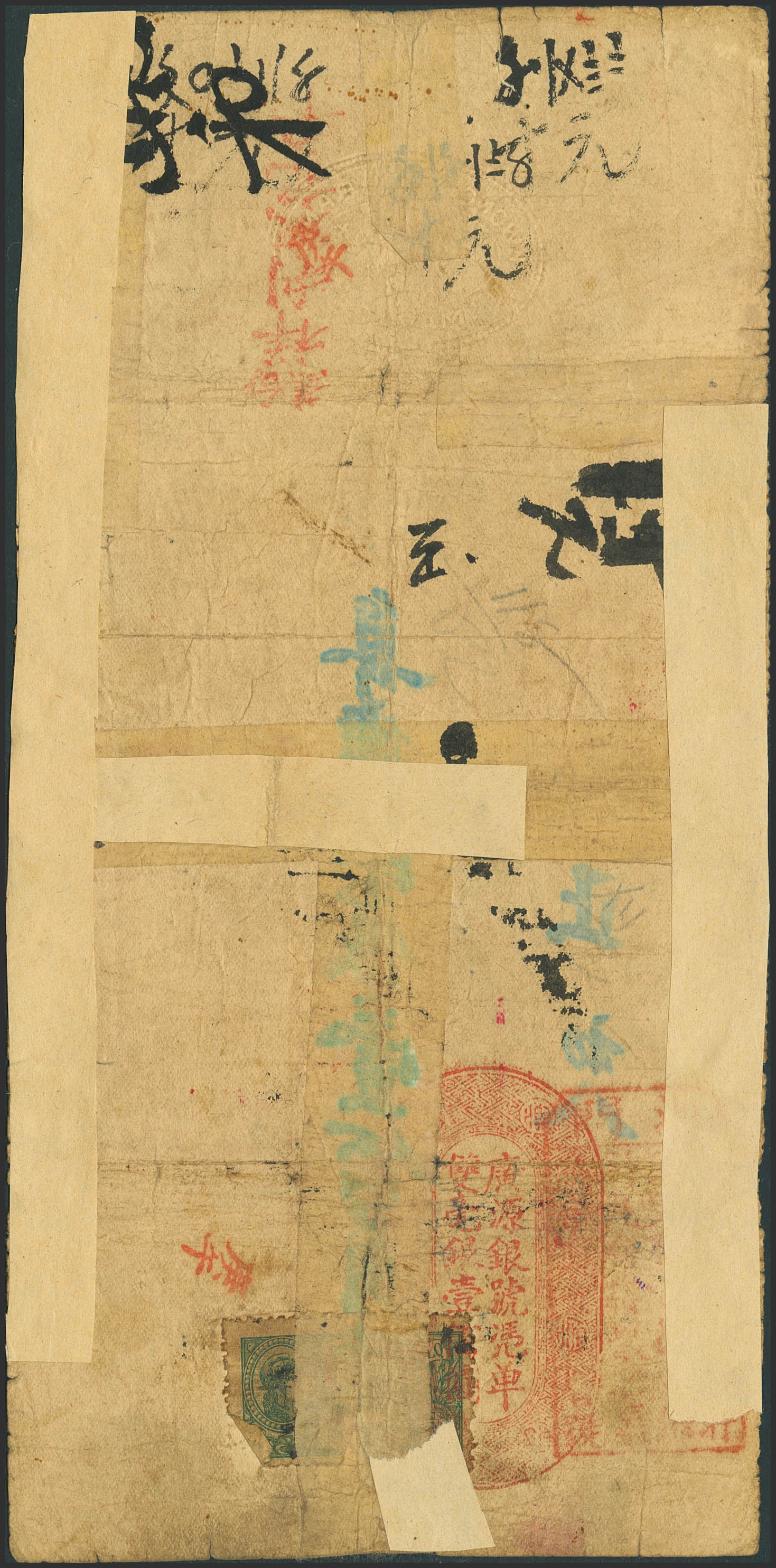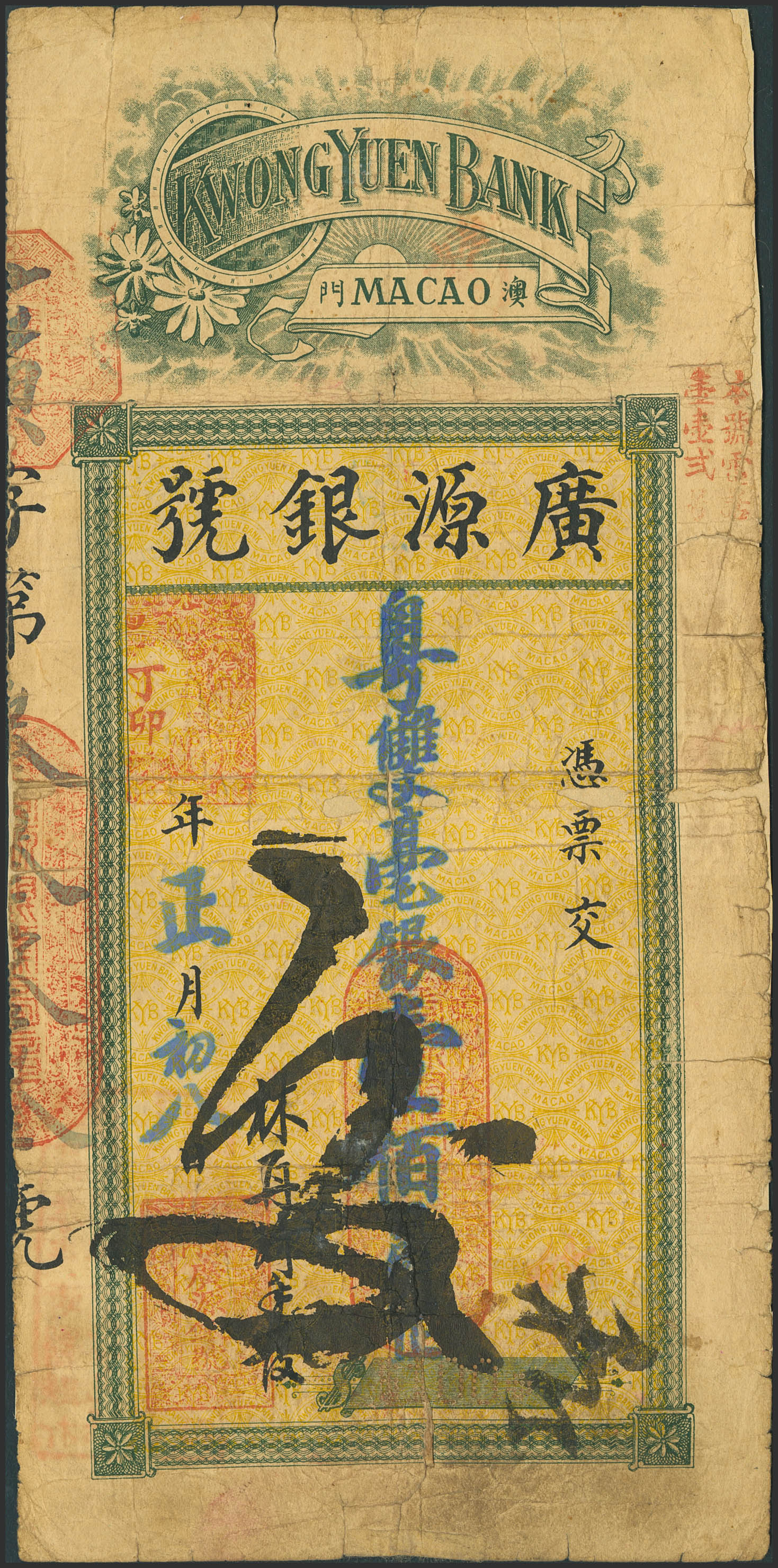 CHINA-MACAU. 200 Dollars. 1925. Kwong Yuen Bank. (Pick: S110). Adhesive paper added over holes in the paper. Fine.