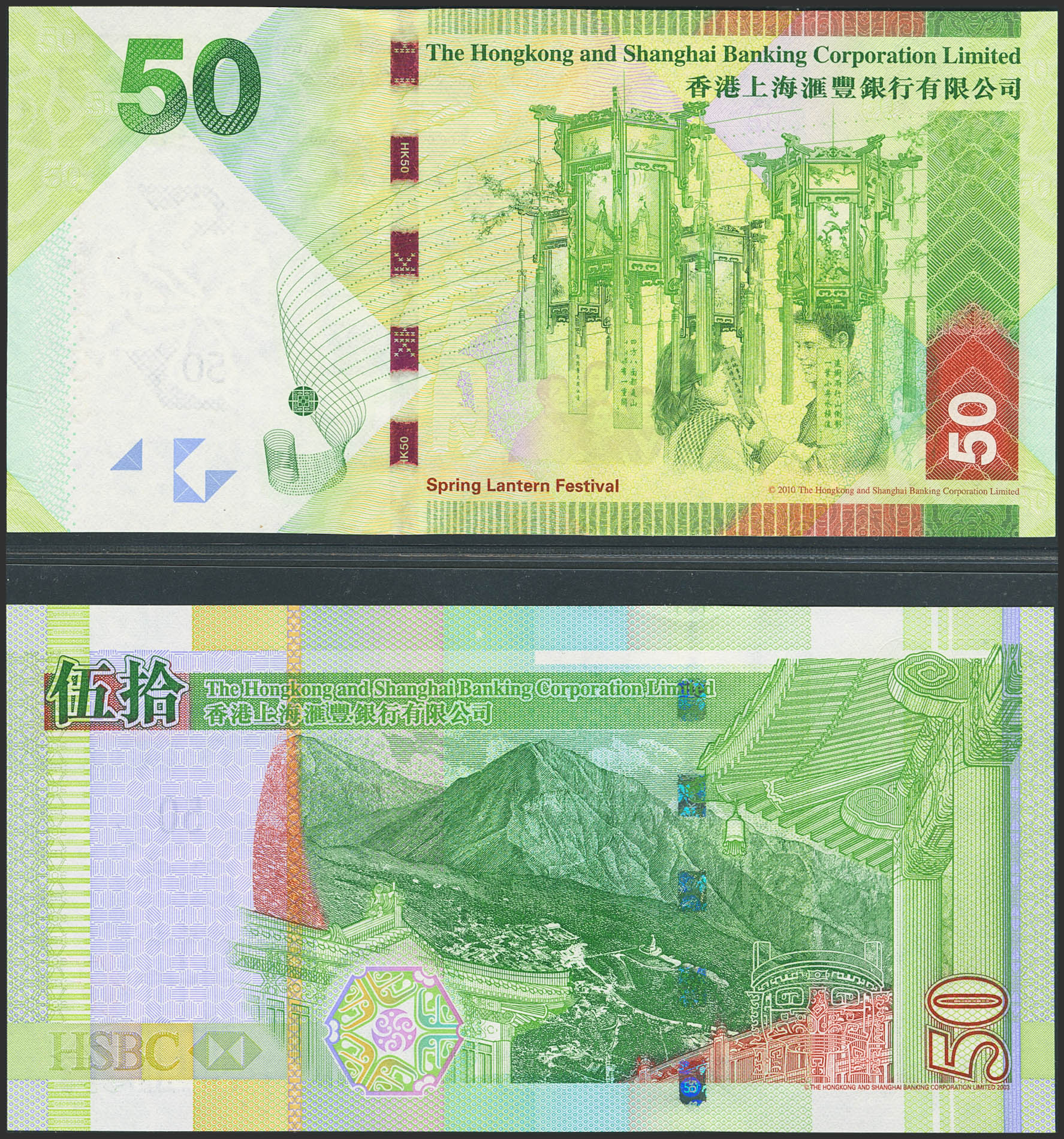 HONG KONG. Lot of 2 notes of 50 Dollars. 1 July 2003 and 1 January 2013. Hongkong and Shanghai Banking Corporation. (Pick: 208a, 213c). Vertical marks on the 213c. Less than Uncirculated and Uncirculated.