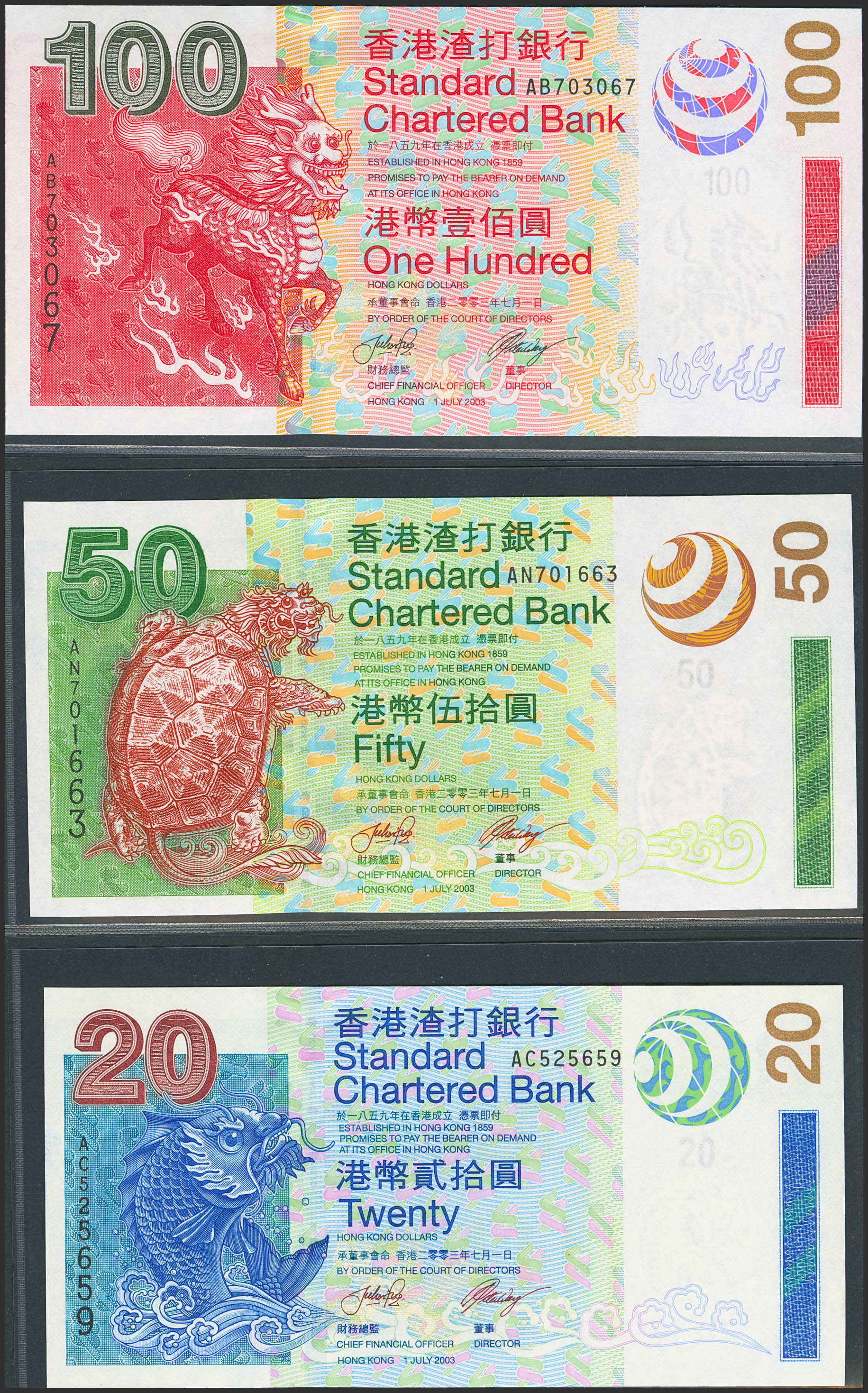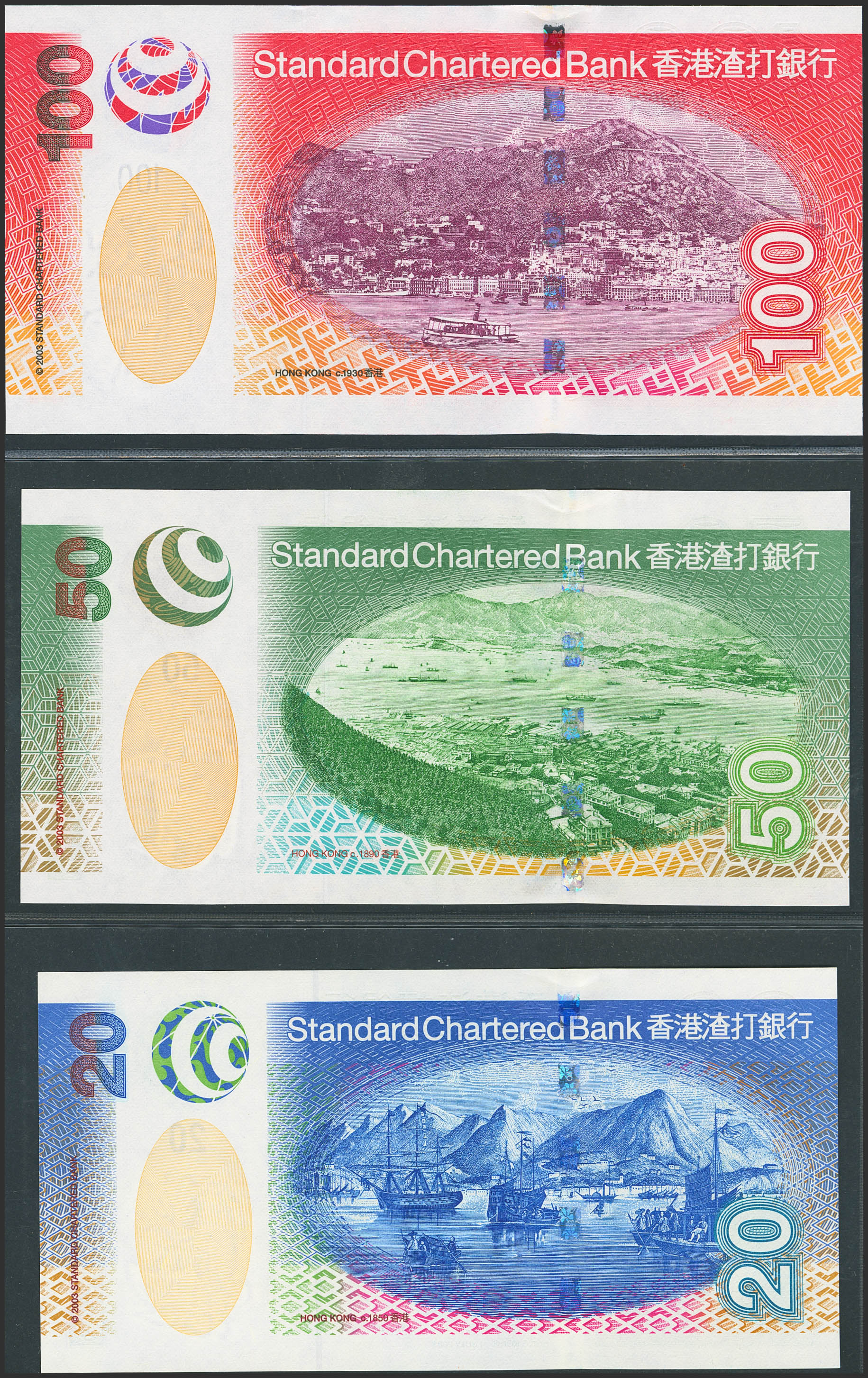 HONG KONG. Lot of 3 notes of 20, 50 and 100 Dollars. 1 July 2003. Standard Chartered Bank. (Pick: 291, 292, 293). The 20 dollar note has horizontal marks. Uncirculated and Less than uncirculated.