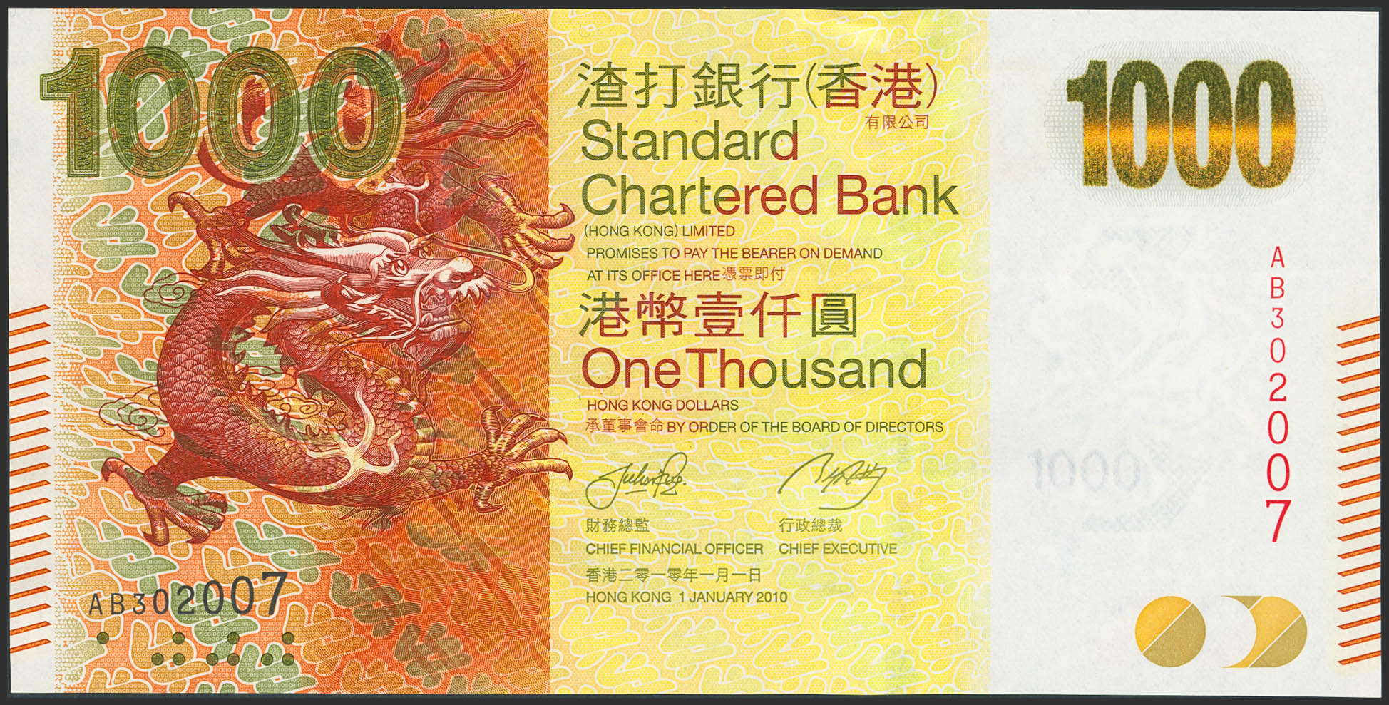 HONG KONG. 1000 Dollars. 1 January 2010. Standard Chartered Bank. (Pick: 301a). Horizontal marks from the printing press roller. Less than Uncirculated.