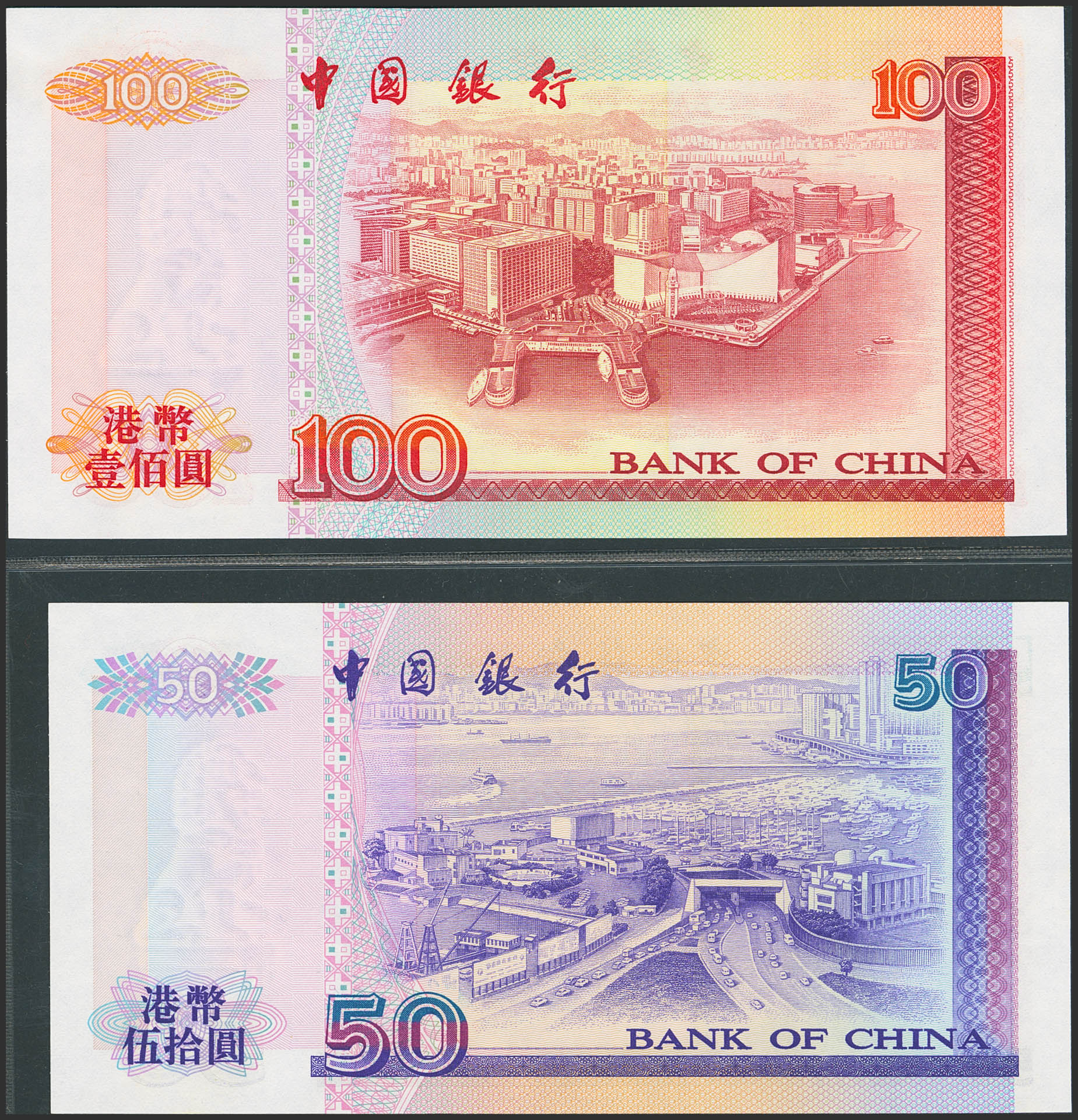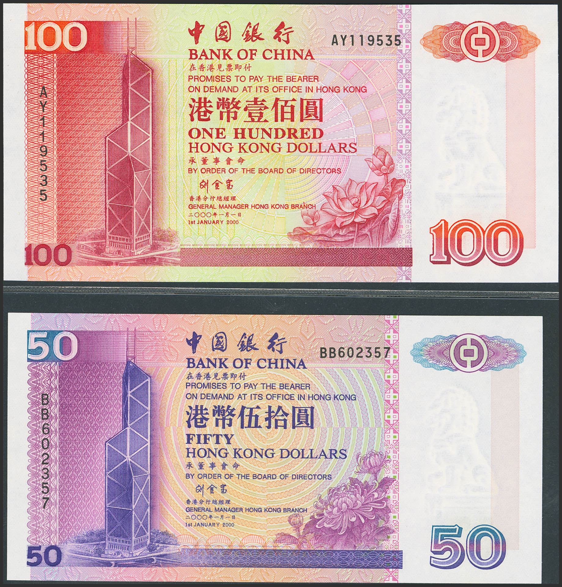 HONG KONG. Lot of 2 notes of 50 and 100 Dollars. 1 January 2000. Bank of China. (Pick: 330f, 331f). Uncirculated.