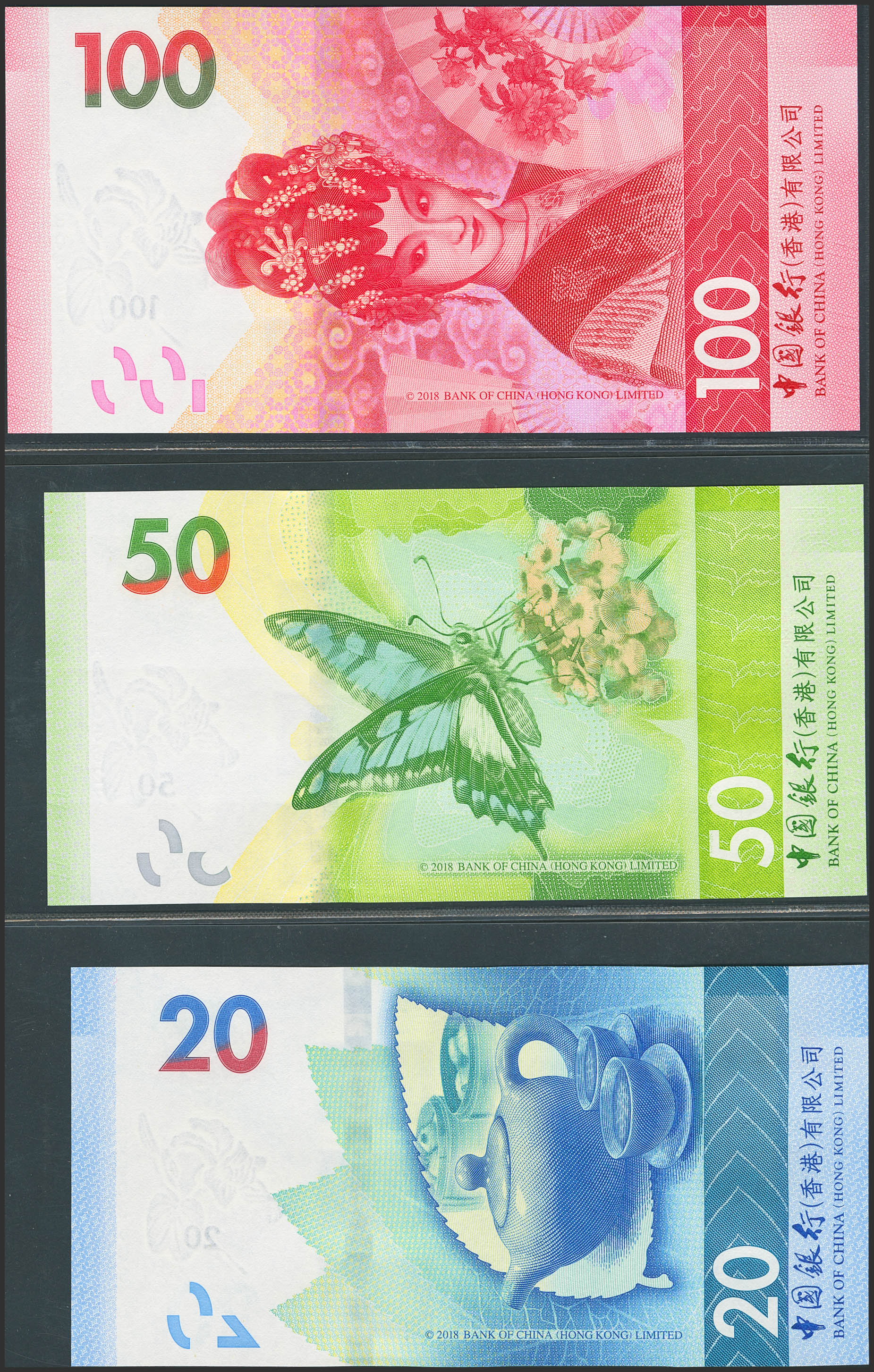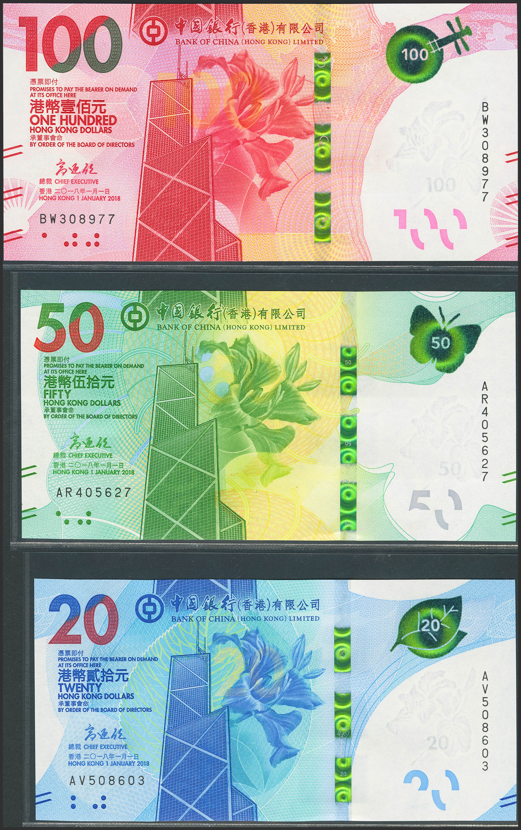 HONG KONG. Lot of 3 notes of 20, 50 and 100 Dollars. 1 January 2018. Bank of China. (Pick: 348a, 349a, 350a). Uncirculated.