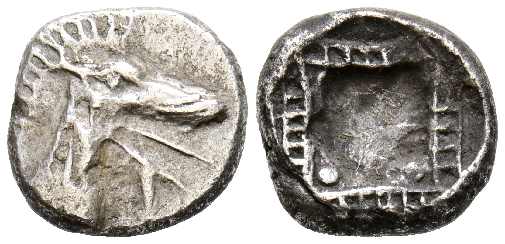 CARIA, Kindya. Tetróbolo. (Ar. 1,64g/12mm). 510-480 a. C. (SNG Kayhan 815). Anv: Cabeza de Cetos a la derecha. Rev: Patrón geométrico dentro de un cuadrado incuso. MBC.