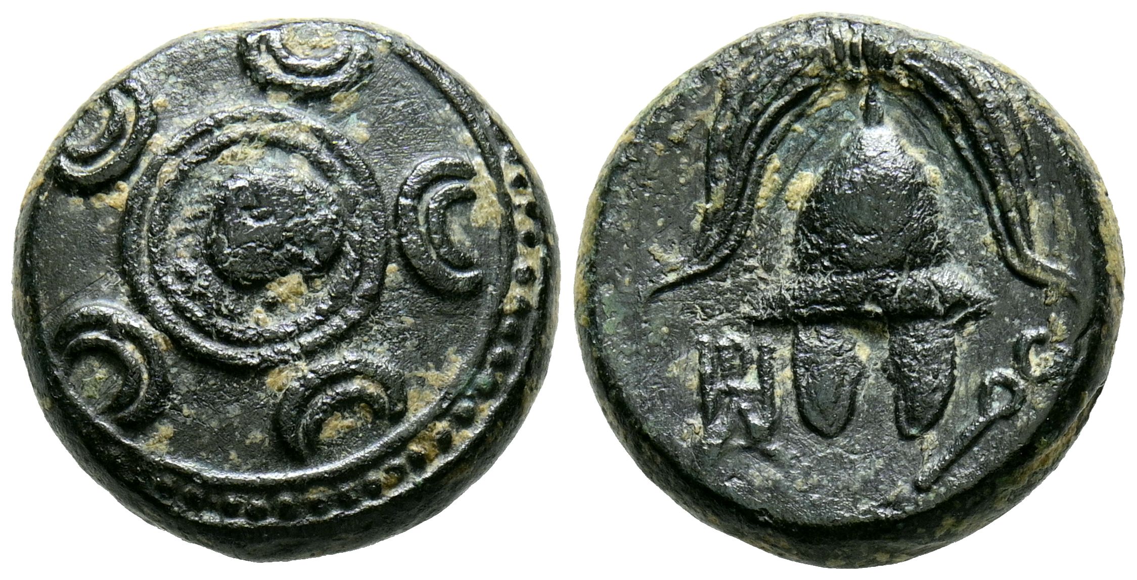 REYES DE MACEDONIA, Filipo III Arrhidaios. Ae15. (Ae. 4,67g/15mm). 323-317 a.C. Ceca incierta del oeste de Asia. (Price 2803). Anv: Cabeza de Heracles con piel de león a derecha dentro de escudo macedonio. Rev: Casco macedonio, a la izquierda monograma griego, a la derecha caduceo. MBC.