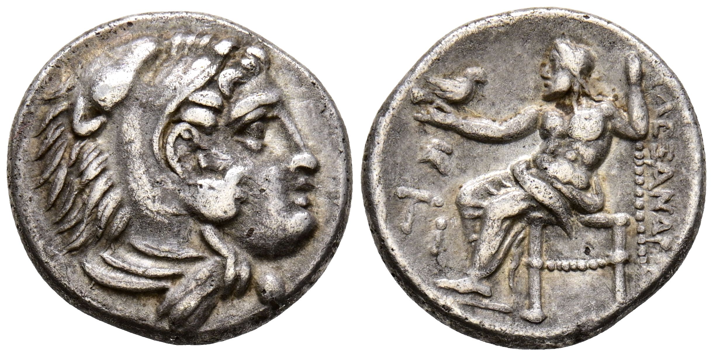 REYES DE MACEDONIA, Alejandro III el Grande. Dracma. (Ar. 4,11g/17mm). 336-323 a.C. Sardis. (Price 2626). Anv: Cabeza de Heracles a derecha con piel de león. Rev: Zeus sentado a izquierda portando águila y cetro, delante abeja y monograma TI, detrás leyenda: AΛEΞANΔPOY. MBC+.