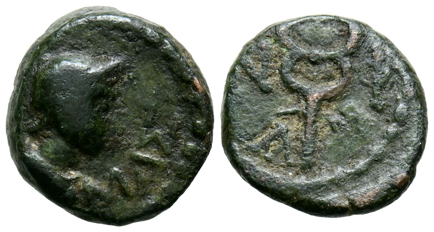 MASSALIA. AE13. (Ae. 2,09g/13mm). 49 a.C. (Depeyrot, Marsella 73). Anv: Cabeza laureada de Apolo, delante: MAΣ. Rev: Caduceo alado, letras griegas: N-Φ y debajo monograma. MBC.