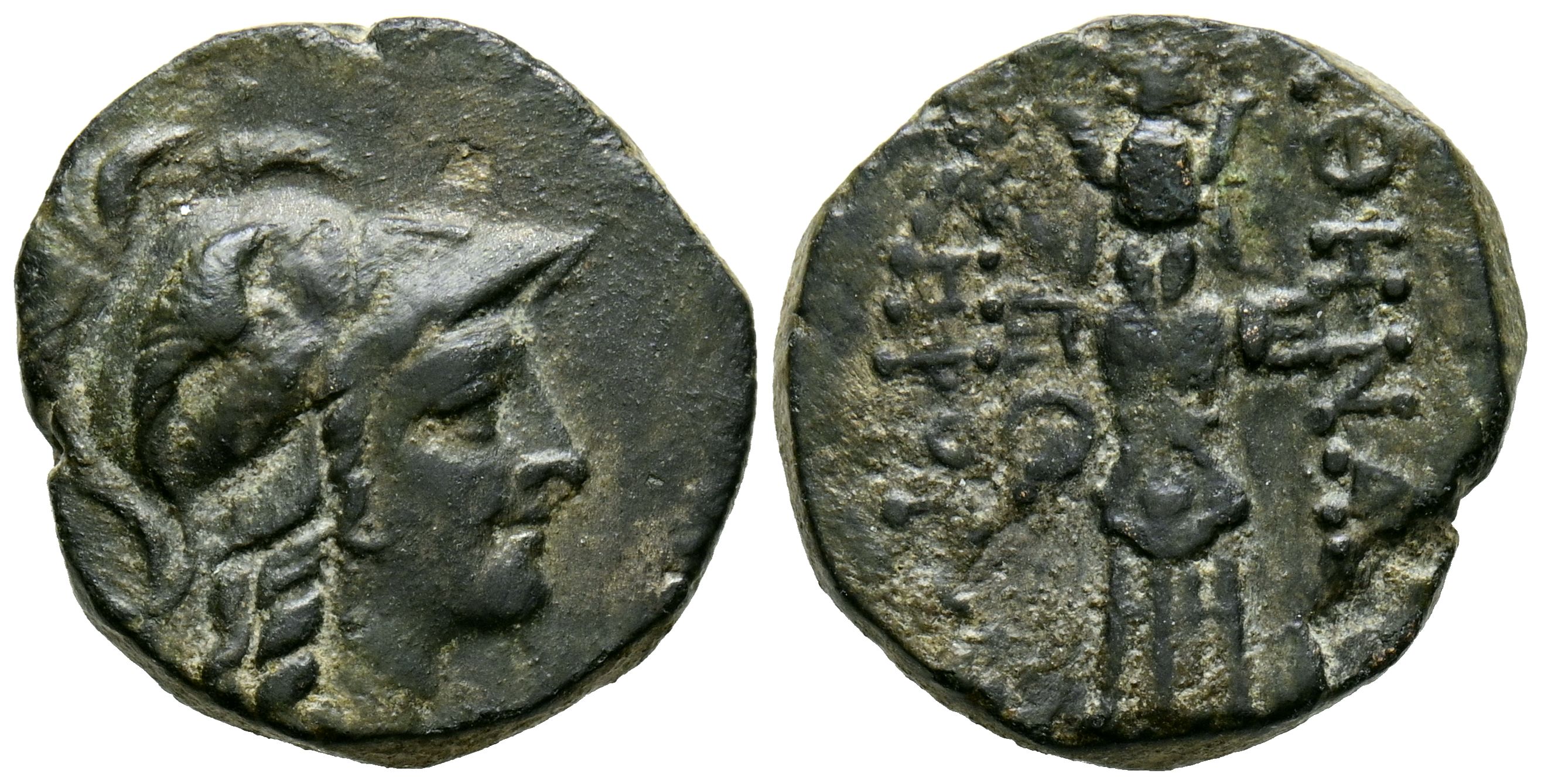 MISIA, Pérgamo. Ae19. (Ae. 4,68g/19mm). Siglo II a.C. (SNG von Aulock 1374). Anv: Cabeza de Atenas con casco a derecha. Rev: Trofeo de casco y coraza, alrededor leyenda griega: AΘHNAΣ NIKHΦOPOY. MBC.