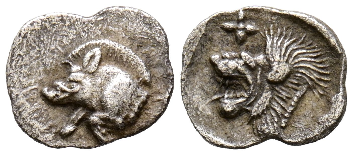 MISIA, Cícico. Hemióbolo. (Ar. 0,36g/10mm). 500-490 a.C. (Klein 265). Anv: Parte delantera de jabalí a izquierda, detrás atún. Rev. Cabeza de león a izquierda, encima estrella. MBC.