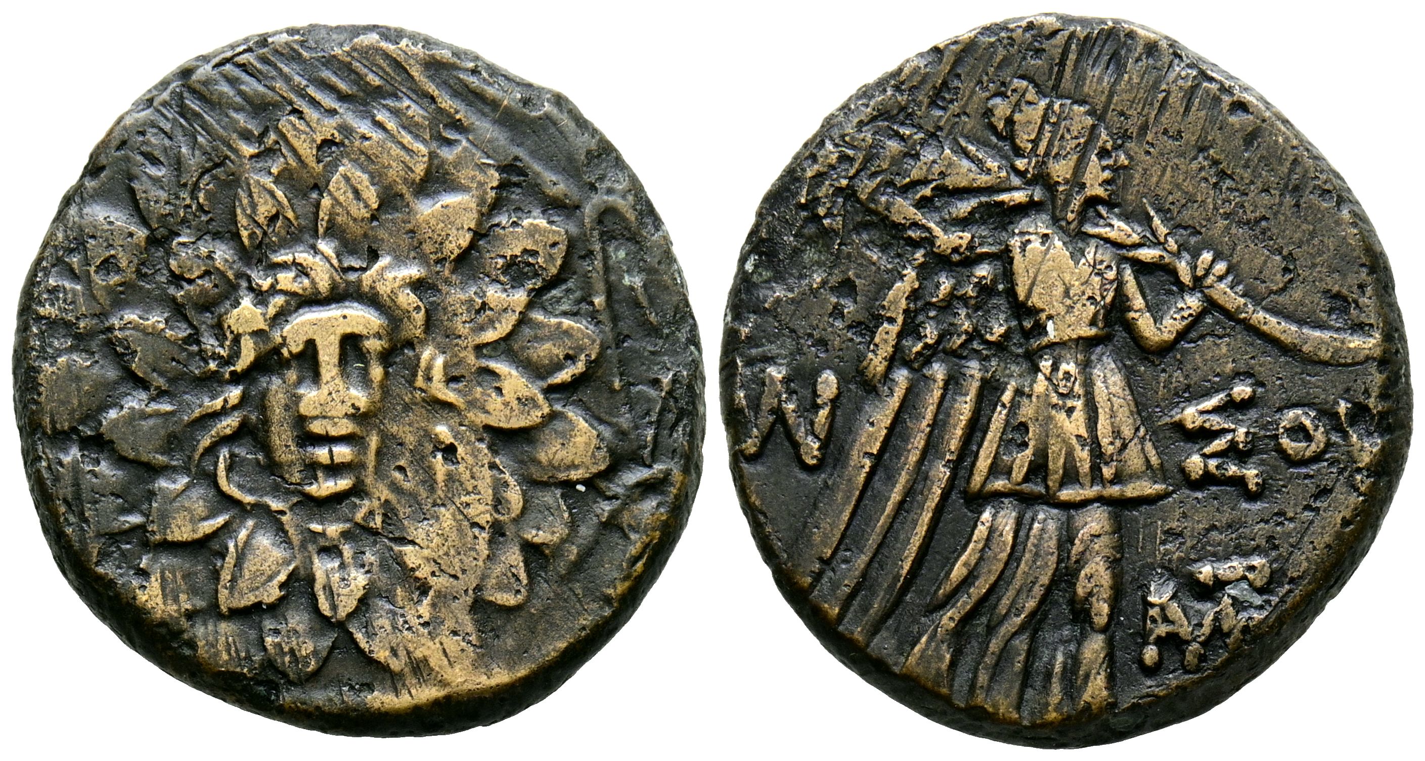 PONTOS, Amisos. Ae22. (Ae. 6,52g/21mm). 85-65 a.C. (HGC 7, 242). Anv: Aegis de frente. Rev: Nike avanzando a derecha con palma, entre leyenda griega: AΜΙ-ΣΟΥ, en campo monograma. MBC-.