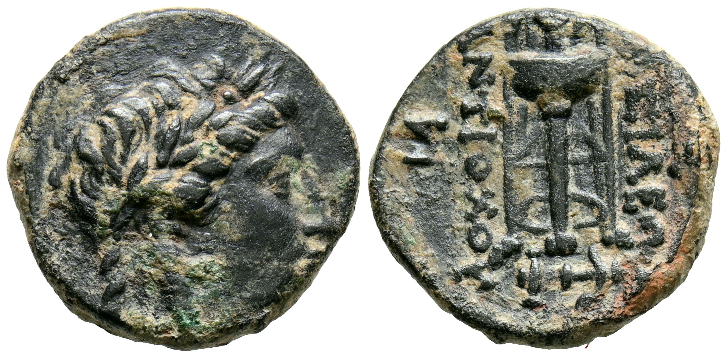IMPERIO SELEUCIDA, Antiocos II Theos. Ae17. (Ae. 3,75g/18mm). 261-246 a.C. Sardes. (HGC 9, 253; Seaby 525). Anv: Cabeza laureada de Apolo a derecha. Rev: Trípode, en campo monograma, debajo ancla, alrededor leyenda griega: ΒΑΣΙΛΕΩΣ-ΑΝΤΙΟΧOΥ. MBC.