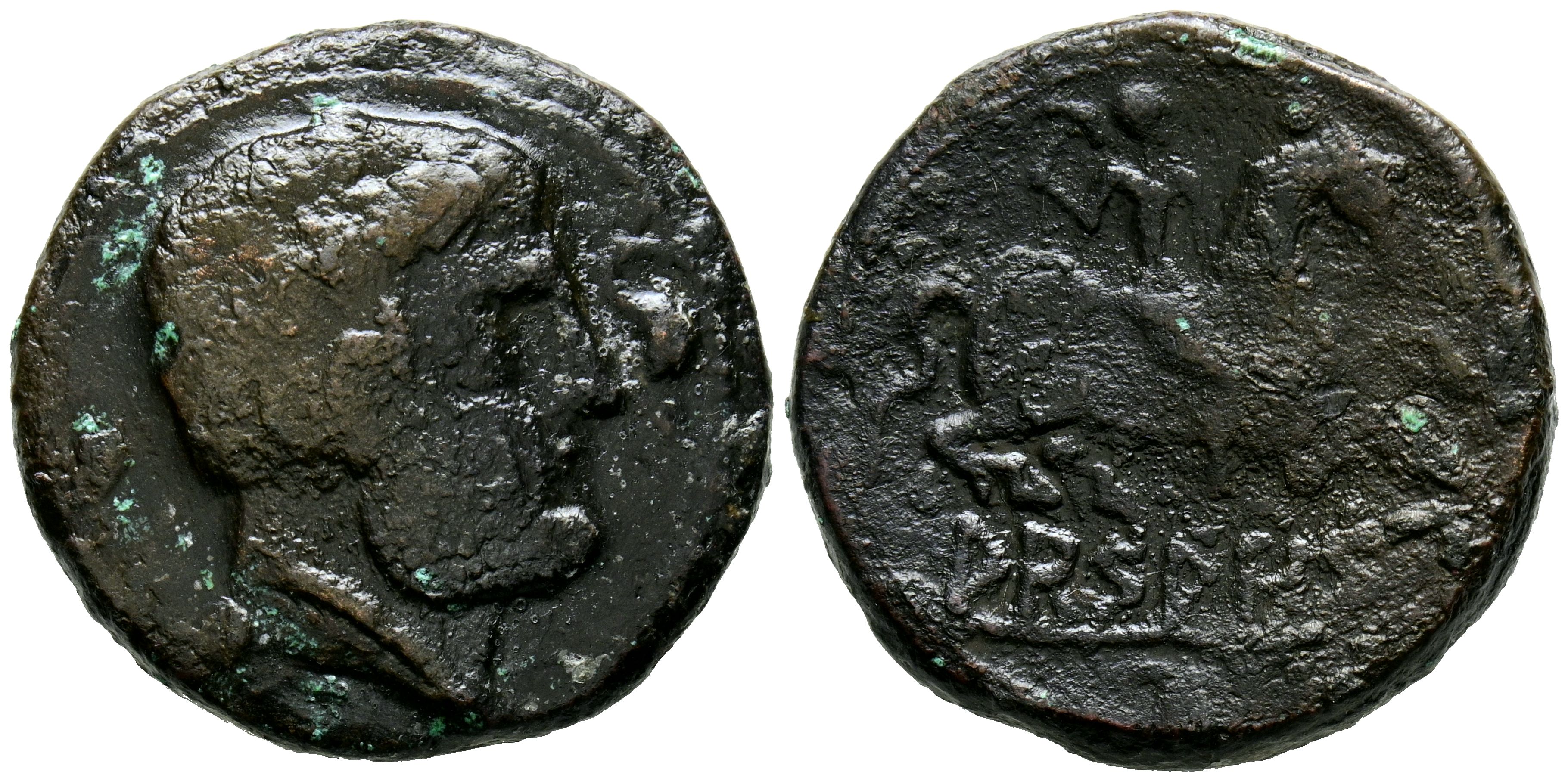 ARSAOS (Zona de Navarra). As. (Ae. 12,38g/25mm). 120-80 a.C. (FAB-143). Anv: Cabeza masculina y barbada a derecha entre dos delfines, debajo letras ibérica: ON. Rev: Jinete con dardo a derecha, debajo leyenda sobre línea: ARSAOS. MBC-. Limpiado.