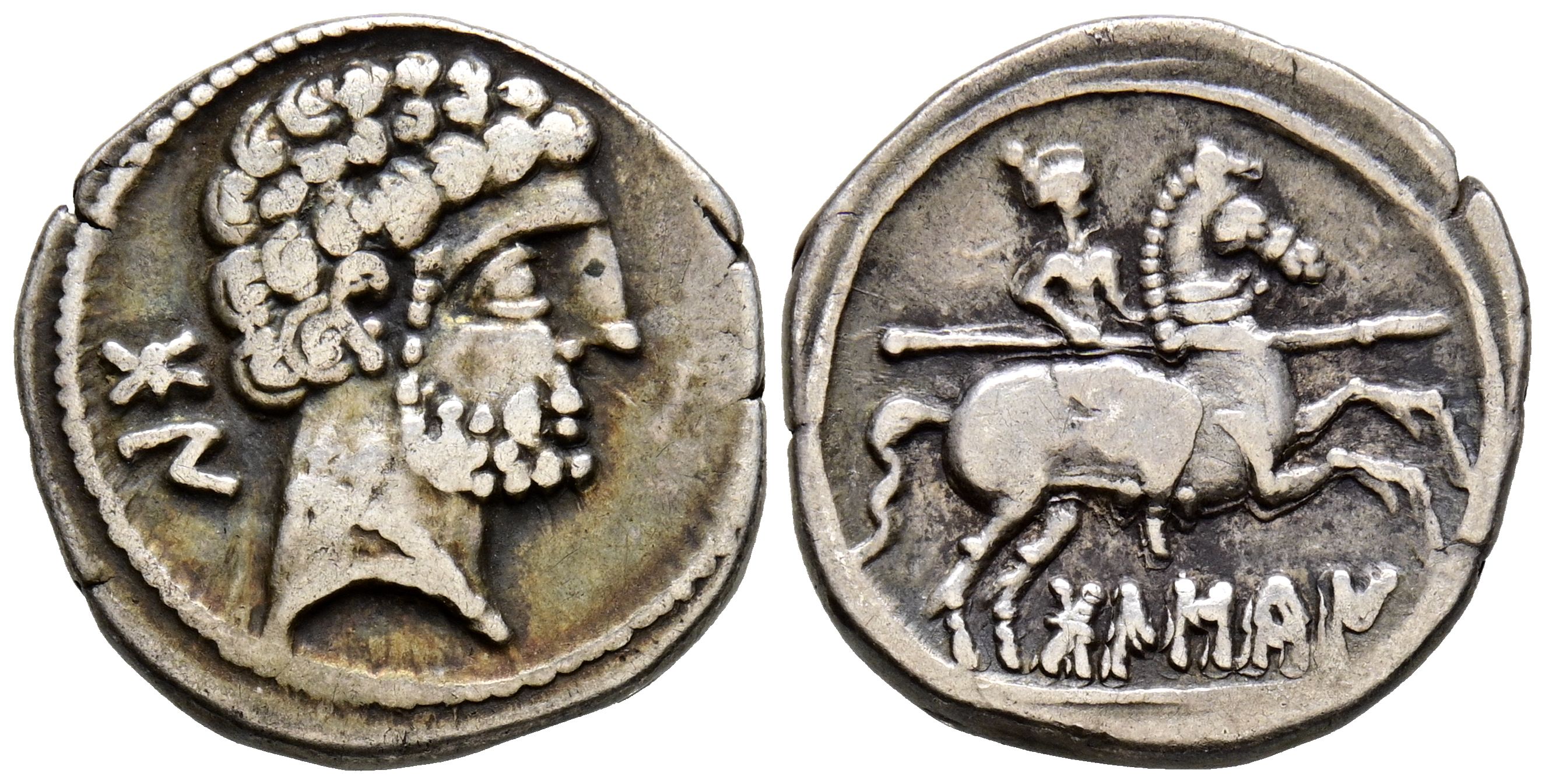 BOLSCAN (Huesca). Denario. (Ar. 3,94g/19mm). 180-20 a.C. (FAB-1911). Anv: Cabeza masculina barbada a derecha, detrás letras ibéricas: BoN. Rev: Jinete con lanza a derecha, debajo leyenda ibérica: BoLSCaN. MBC.
