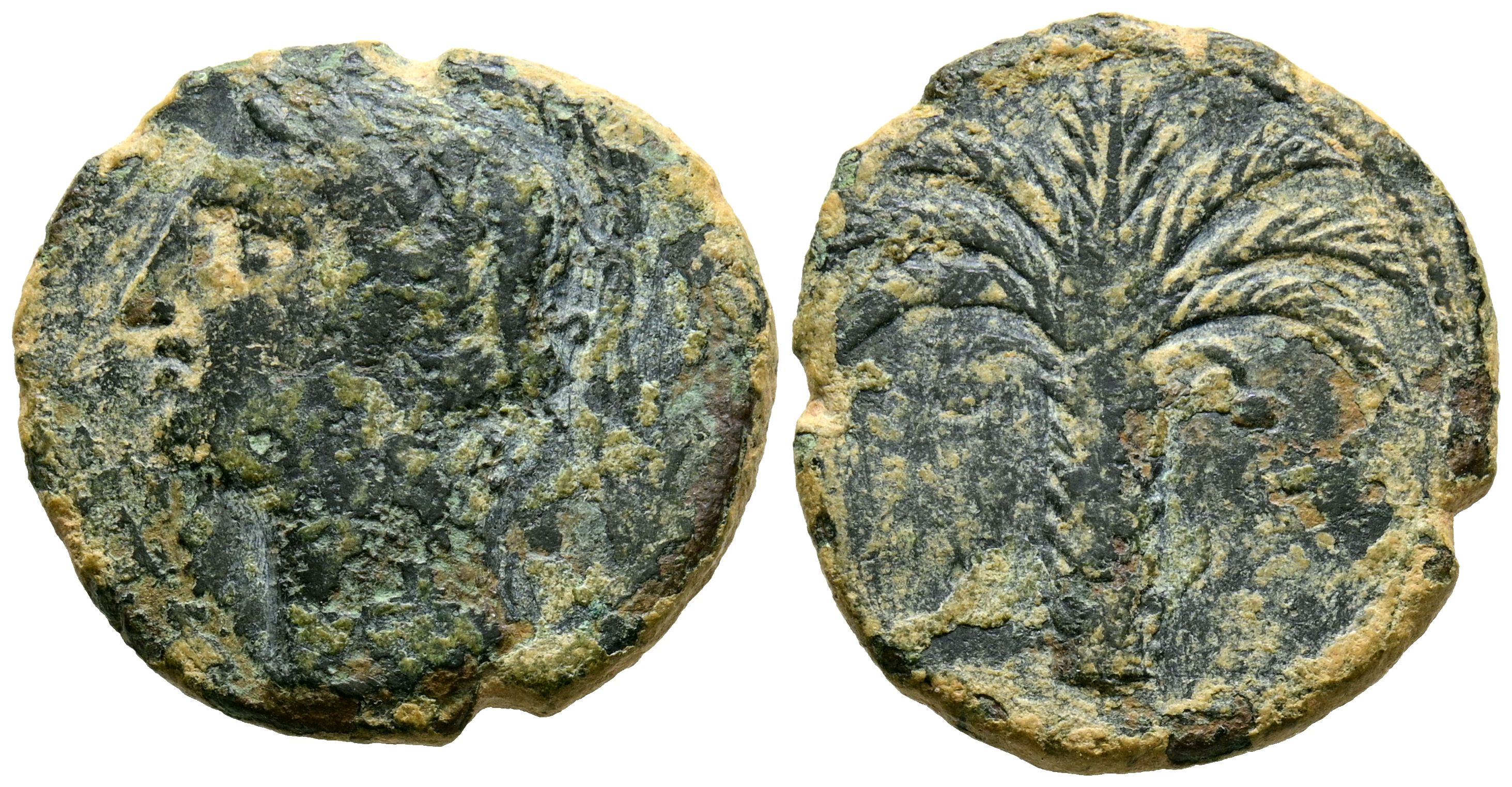 CARTAGONOVA (Cartagena, Murcia). 1/2 Calco. (Ae. 5,41g/21mm). 220-215 a.C. (FAB-532). Anv: Cabeza de Atenas con casco crestado a izquierda. Rev: Palmera. MBC-.