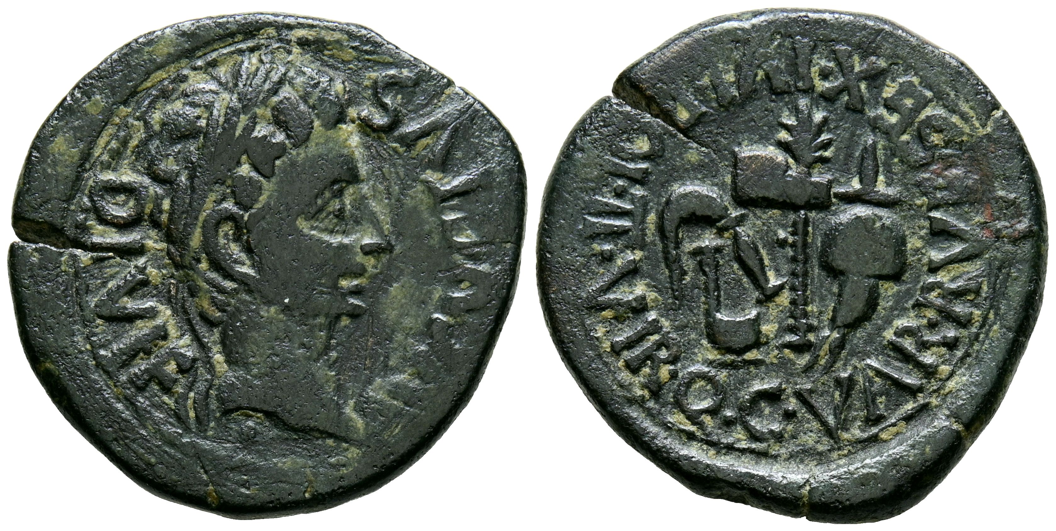CARTAGONOVA (Cartagena, Murcia). Semis. (Ae. 7,12g/24mm). 27 a.C.-14 d.C. (FAB-594). Anv: Cabeza de Augusto laureada a derecha, alrededor leyenda: AVGVSTVS DIVI F. Rev: Aspergillus, símbolo, caja fuerte y ápice, alrededor leyenda: C VAR RVF SEXO IVL POL II VOR Q. MBC/MBC+.
