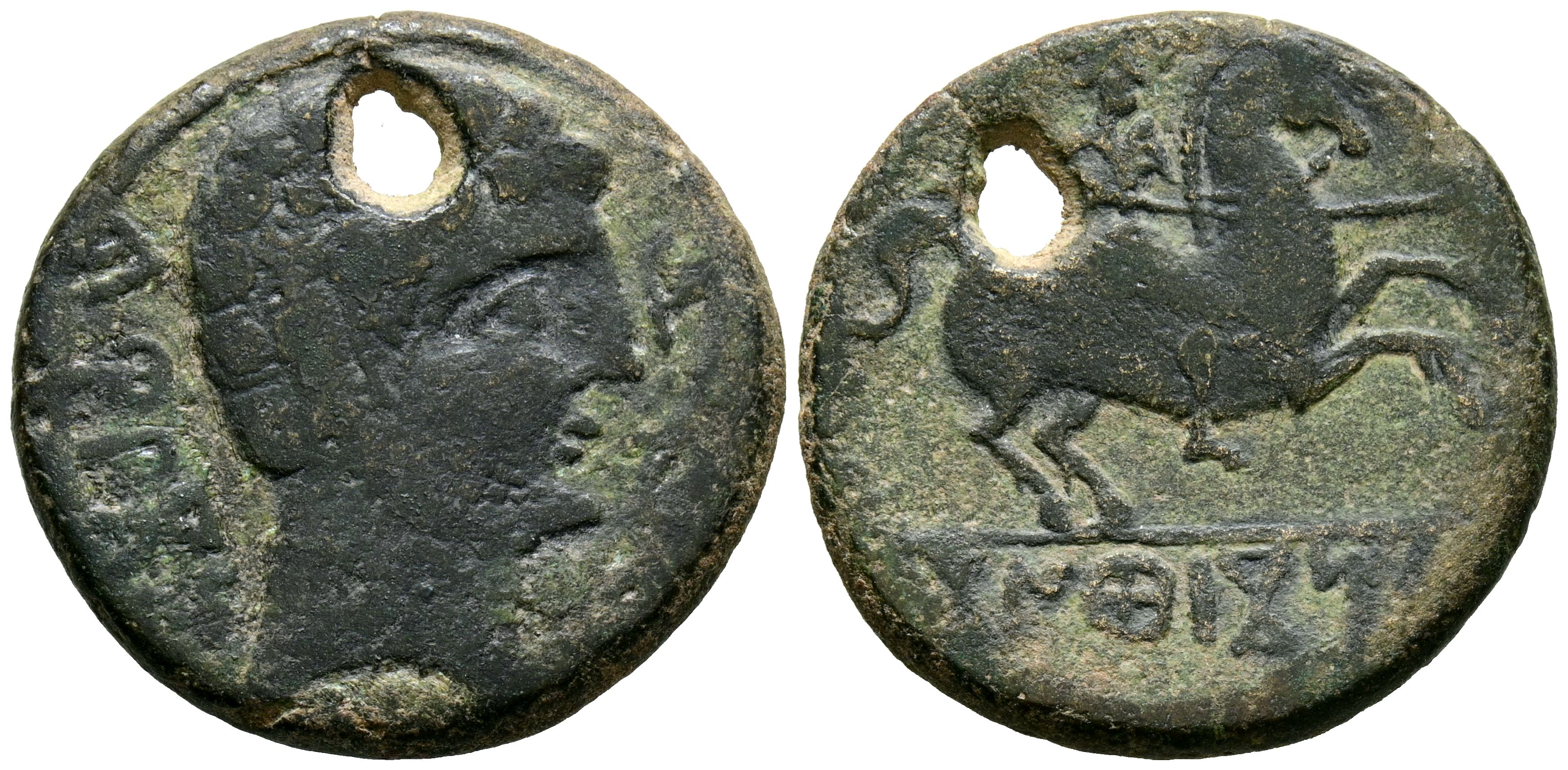 CONTERBIA CARBICA (Huete, Cuenca). As. (Ae. 8,21g/25mm). 120-80 a.C. (FAB-846). Anv: Cabeza masculina a derecha, detrás leyenda: CaRBiCa, delante delfín. Rev: Jinete con lanza a derecha, debajo leyenda ibérica bajo línea: CoNTeBaCoM. BC+. Perforación.