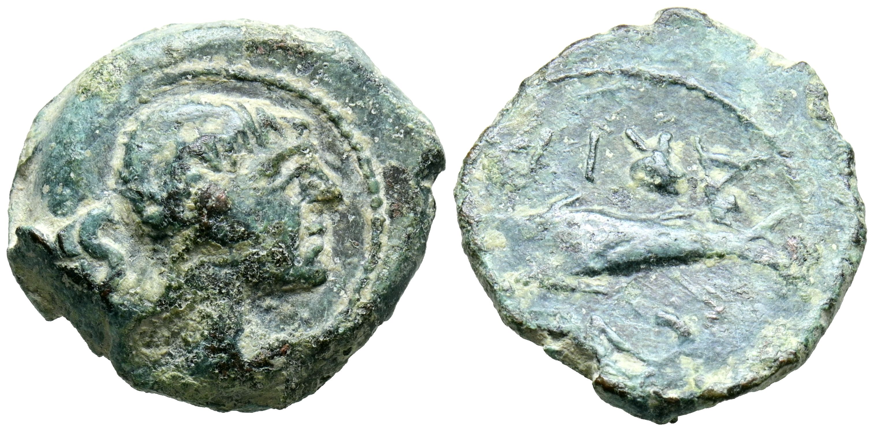 CUNBARIA (entre Cabezas de San Juan y Lebrija, Sevilla). Semis. (Ae. 7,76g/22mm). 50 a.C. (FAB-880). Anv: Cabeza masculina a derecha, detrás S. Rev: Atún a izquierda, entre leyenda: CVNB/ARIA. MBC.