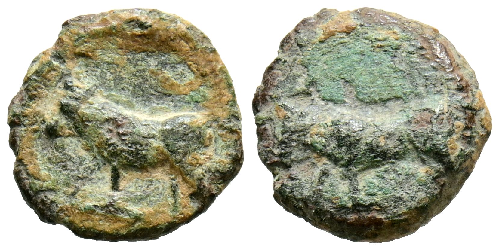 EBUSUS (Ibiza). 1/8 Calco. (Ae. 1,05g/11mm). 300-200 a.C. (FAB-906). Anv: Toro a izquierda. Rev: Toro a izquierda. MBC.