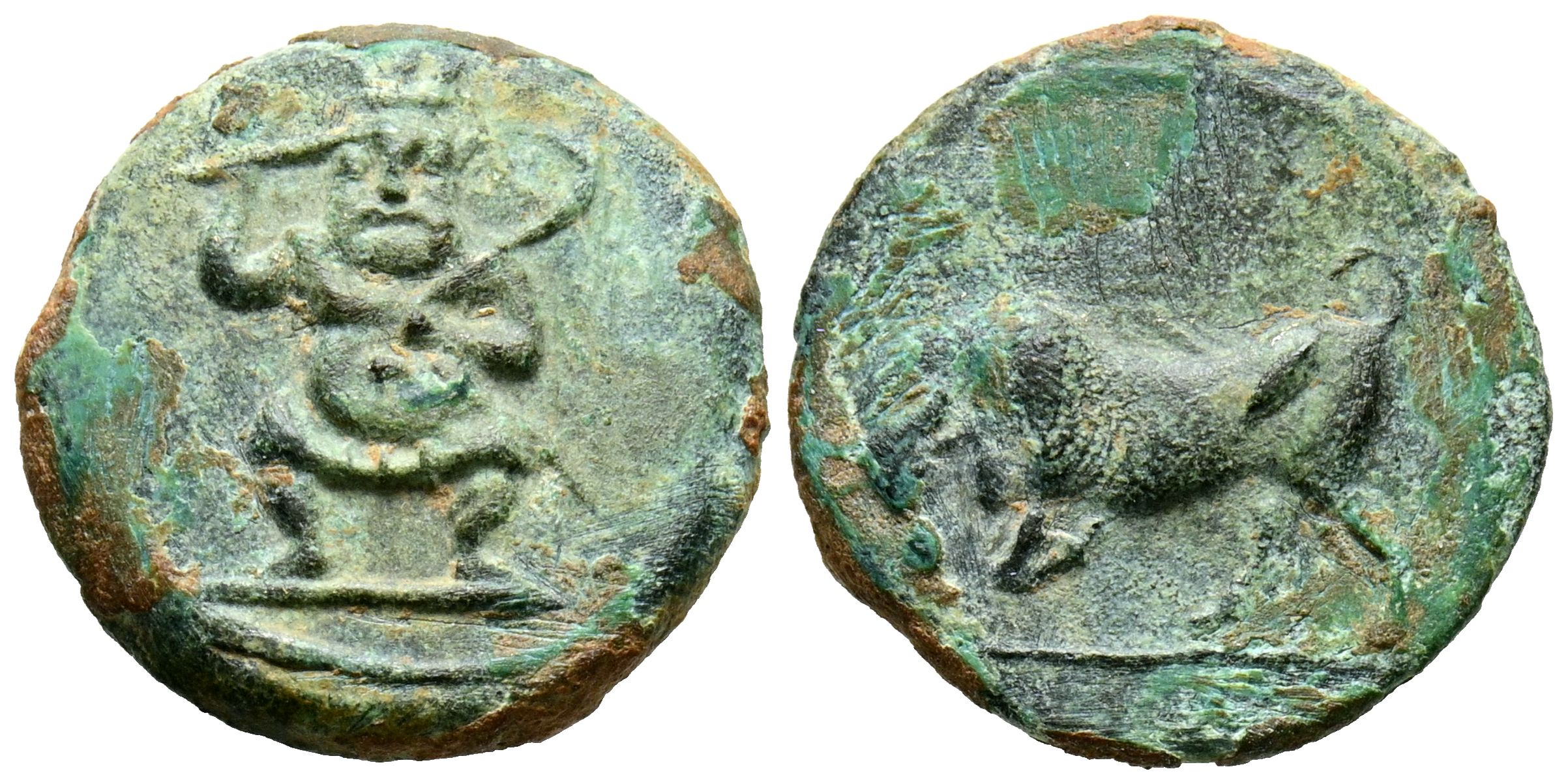 EBUSUS (Ibiza). 1/4 Calco. (Ae. 3,04g/16mm). 200-100 a.C. (FAB-923). Anv: Bes con faldellín de frente sosteniendo martillo y serpiente. Rev: Toro embistiendo a izquierda. MBC+. Bonito ejemplar.