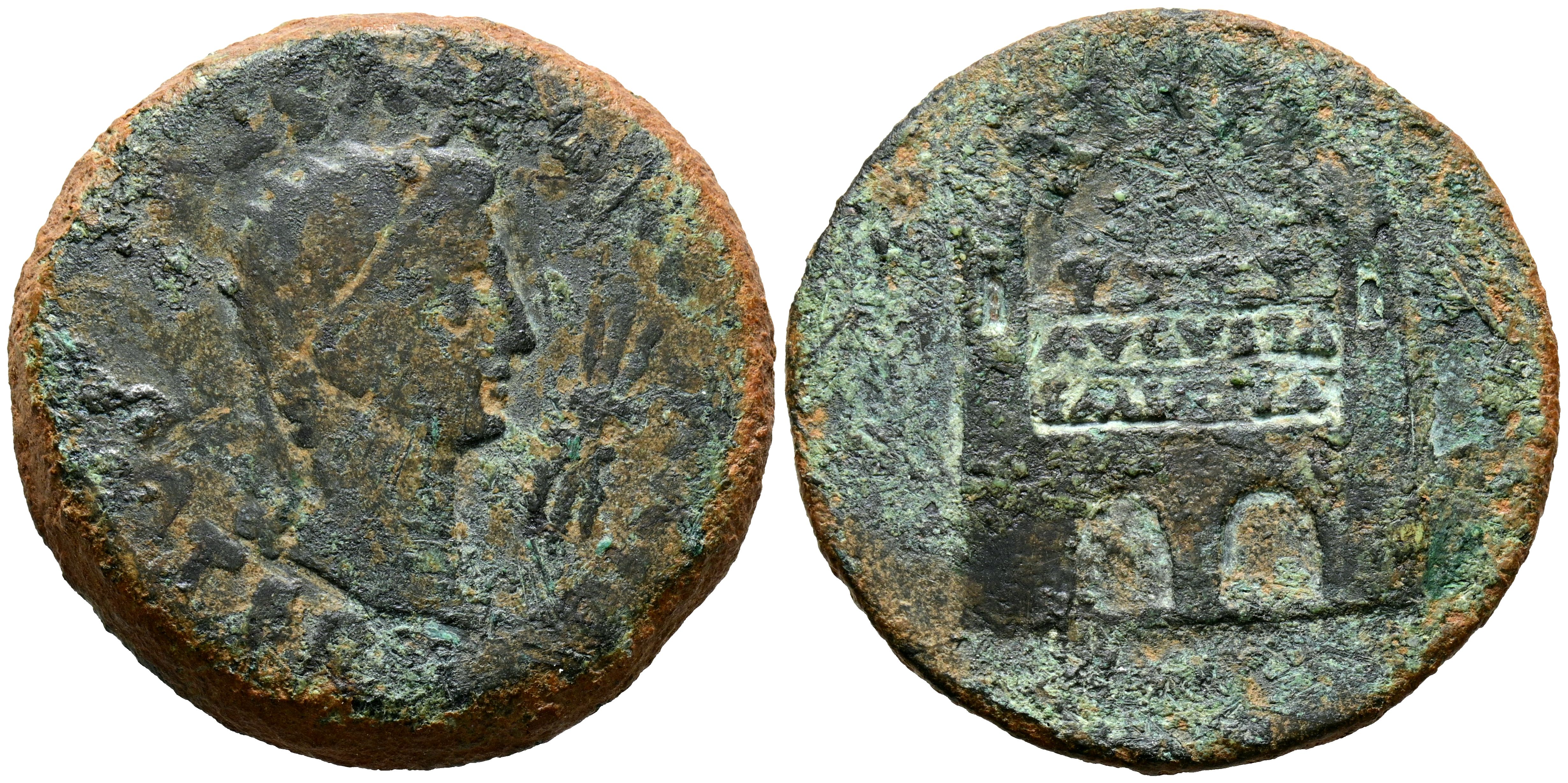 EMERITA AUGUSTA (Mérida). Dupondio. (Ae. 25,19g/34mm). 14-36 d.C. (FAB-1027). Anv: Cabeza radiada de Augusto a derecha, delante rayos, alrededor leyenda: DIVVS AVGVSTVS PATER. Rev: Puerta de la ciudad con inscripción: AVGVSTA/EMERITA. BC+.