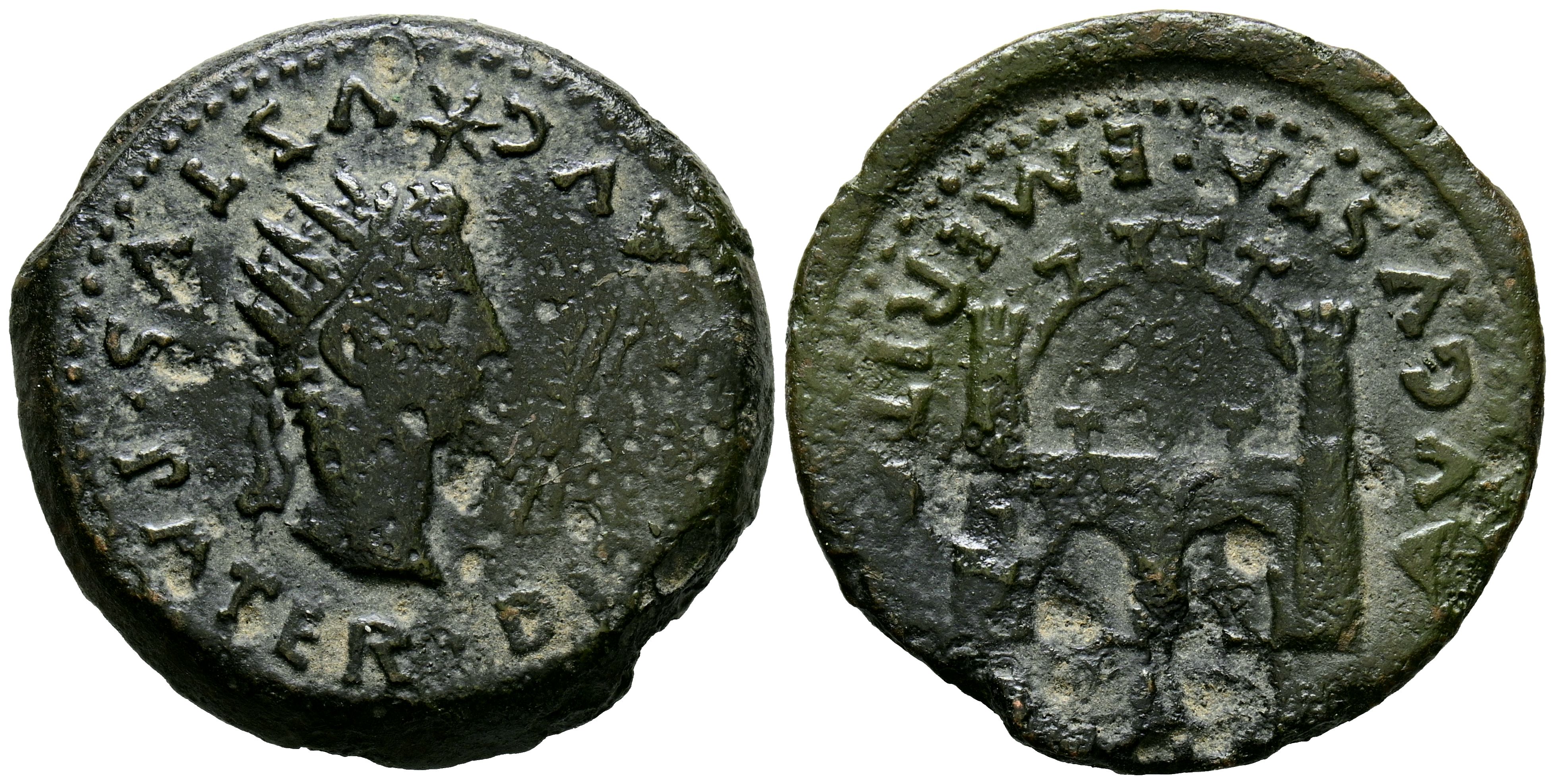 EMERITA AUGUSTA (Mérida). As. (Ae. 11,18g/28mm). 14-36 d.C. (FAB-1040). Anv: Cabeza radiada de Augusto a derecha, encima estrella, delante rayos, alrededor leyenda: DIVVS AVGVSTVS PATER. Rev: Puerta de la ciudad, alrededor leyenda: COL AVGVSTA EMERITA. MBC.