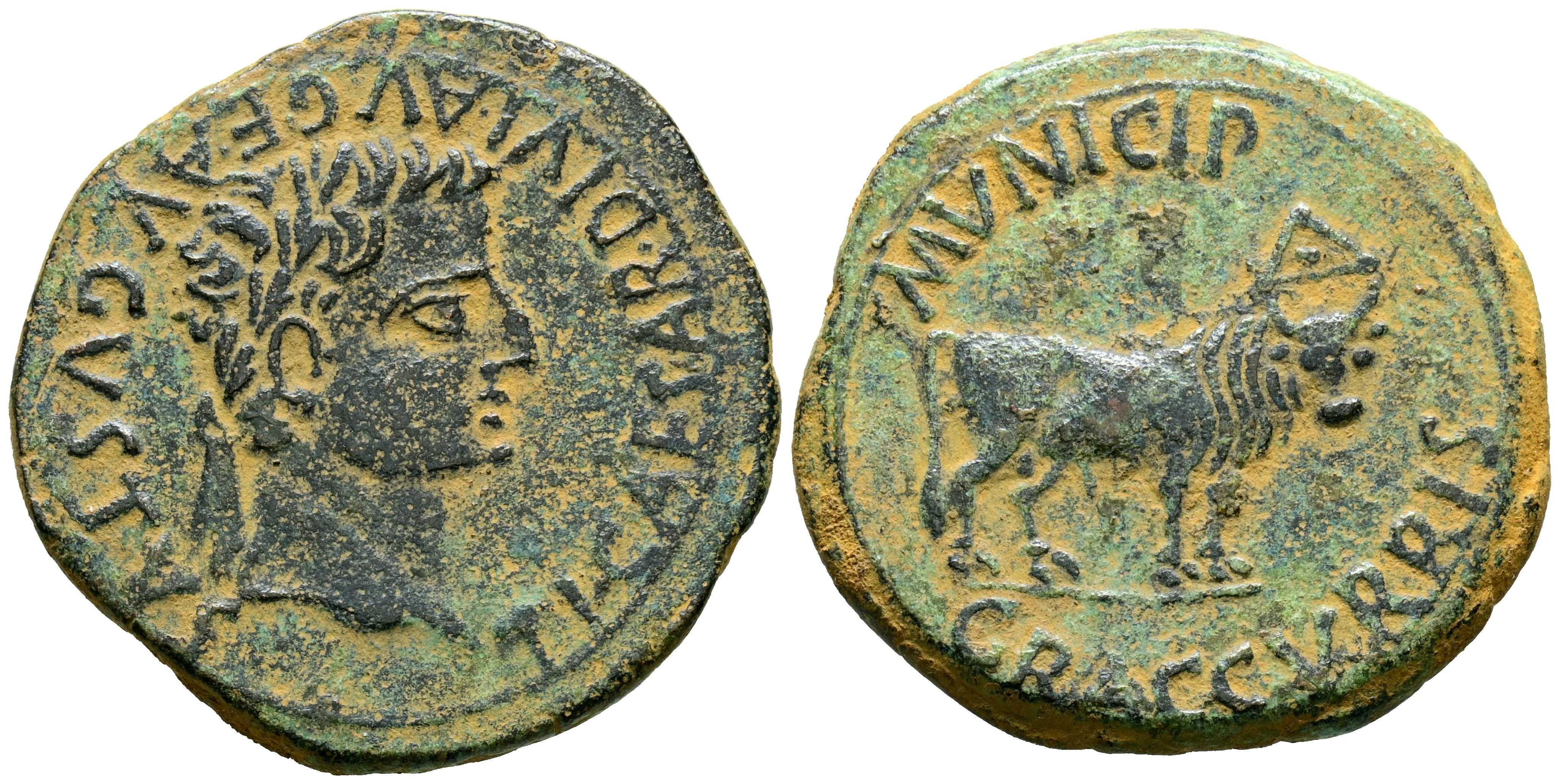 GRACURRIS (Alfaro, La Rioja). As. (Ae. 12,24g/29mm). 14-36 d.C. (FAB-1391). Anv: Cabeza laureada de Tiberio a derecha, alrededor leyenda: TI CAESAR DIVI AVG F AVGVSTVS. Rev: Toro a derecha, alrededor leyenda: MVNICIP GRACVRRIS. MBC.