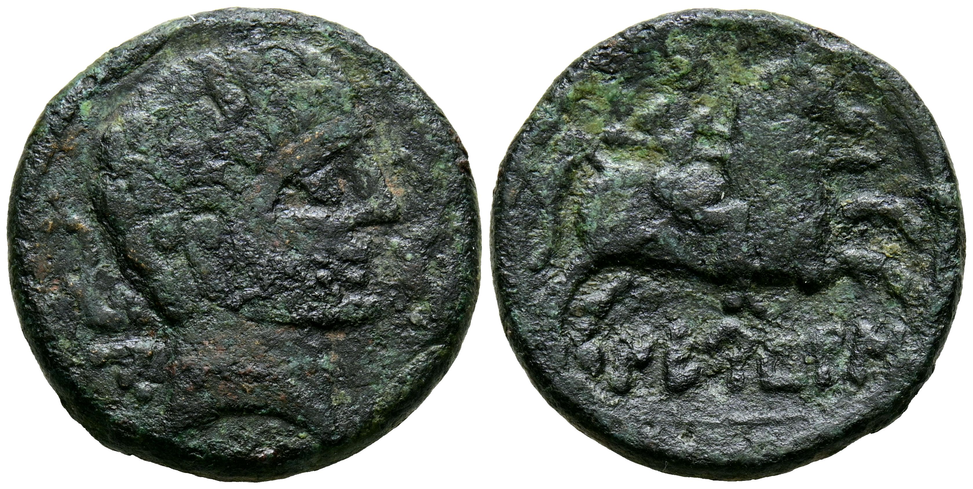 NERTOBIS (Calatorao, Zaragoza). As. (Ae. 8,77g/23mm). 120-20 a.C. (FAB-1771). Anv: Cabeza masculina a derecha entre dos delfines, detrás letra ibérica N. Rev: Jinete con lanza a derecha, debajo leyenda ibérica: NERToBiS. MBC-.