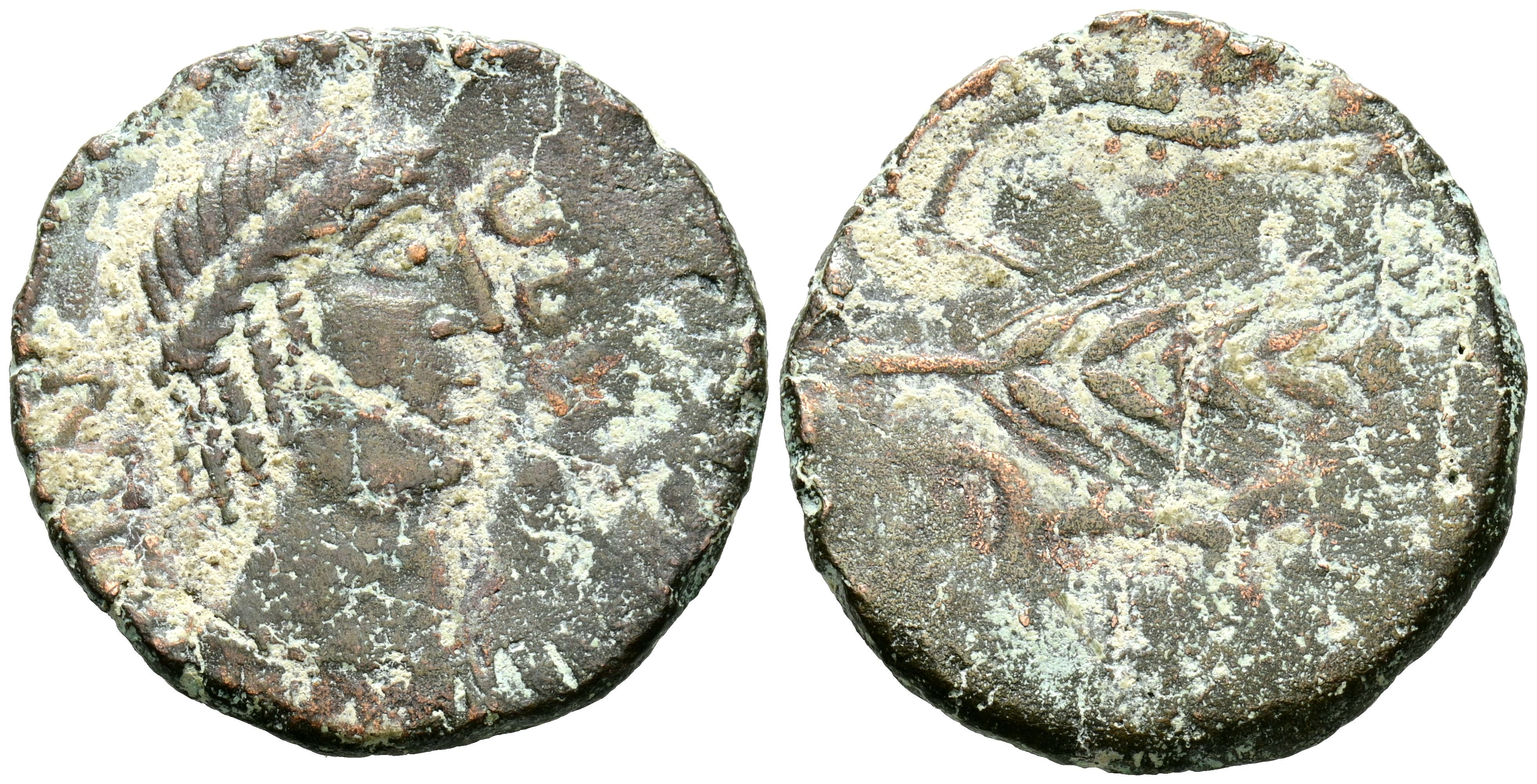 OBULCO (Porcuna, Jaén). As. (Ae. 10,85g/27mm). 220-20 a.C. (FAB-1826). Anv: Cabeza laureada de Apolo a la derecha, alrededor de la leyenda: OBVL NIG. Rev: Arado izquierdo, espiga derecha, bajo yugo. BC-. Limpiada.