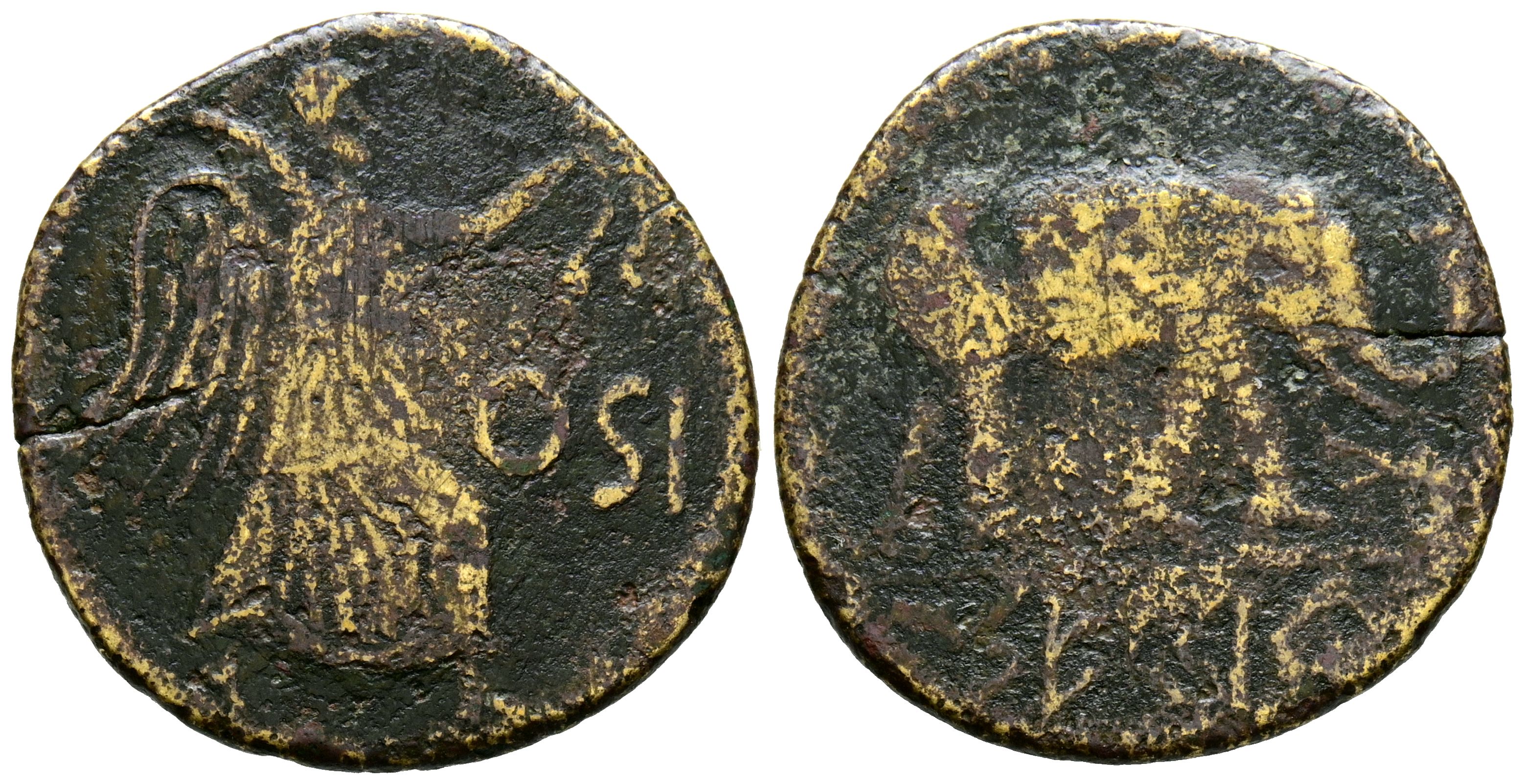 OSICERDA (Zona de Tarragona-Teruel). Semis. (Ae. 4,01g/22mm). 50-20 a.C. (FAB-1956; ACIP 1292). Anv: Victoria avanzando a derecha con corona y palma, delante: OSI. Rev: Elefante avanzando a derecha pisando carnyx galo, debajo entre líneas: USEKeRTe. BC/BC-. Rara.