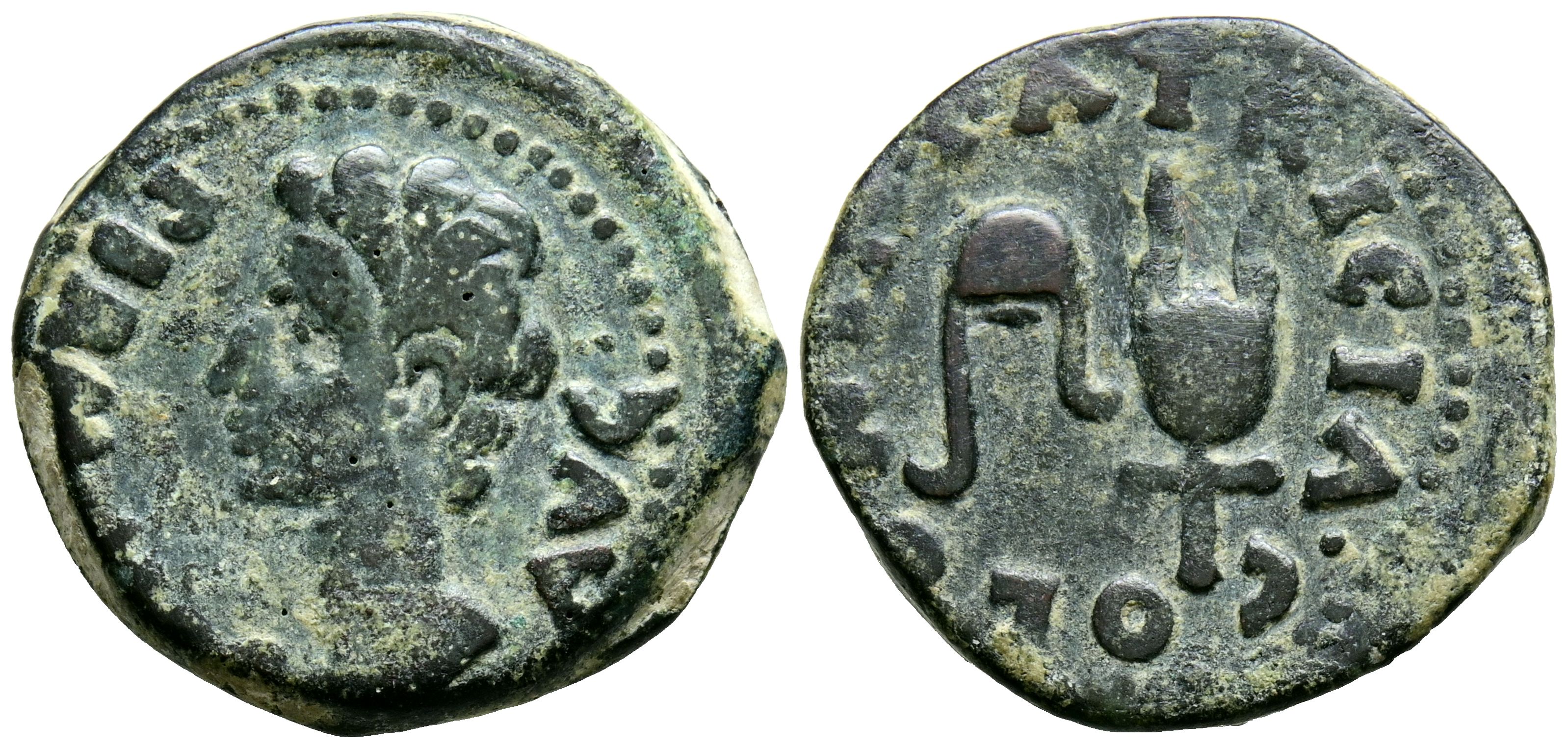COLONIA PATRICIA (Córdoba). Semis. (Ae. 5,85g/22mm). 27 a.C.-14 d.C. (FAB-1992). Anv: Cabeza de Augusto a la izquierda, alrededor leyenda: PERM CAES AVG. Rev: Sombrero flamígero y símbolo, alrededor de la leyenda: COLONIA PATRICIA. MBC.